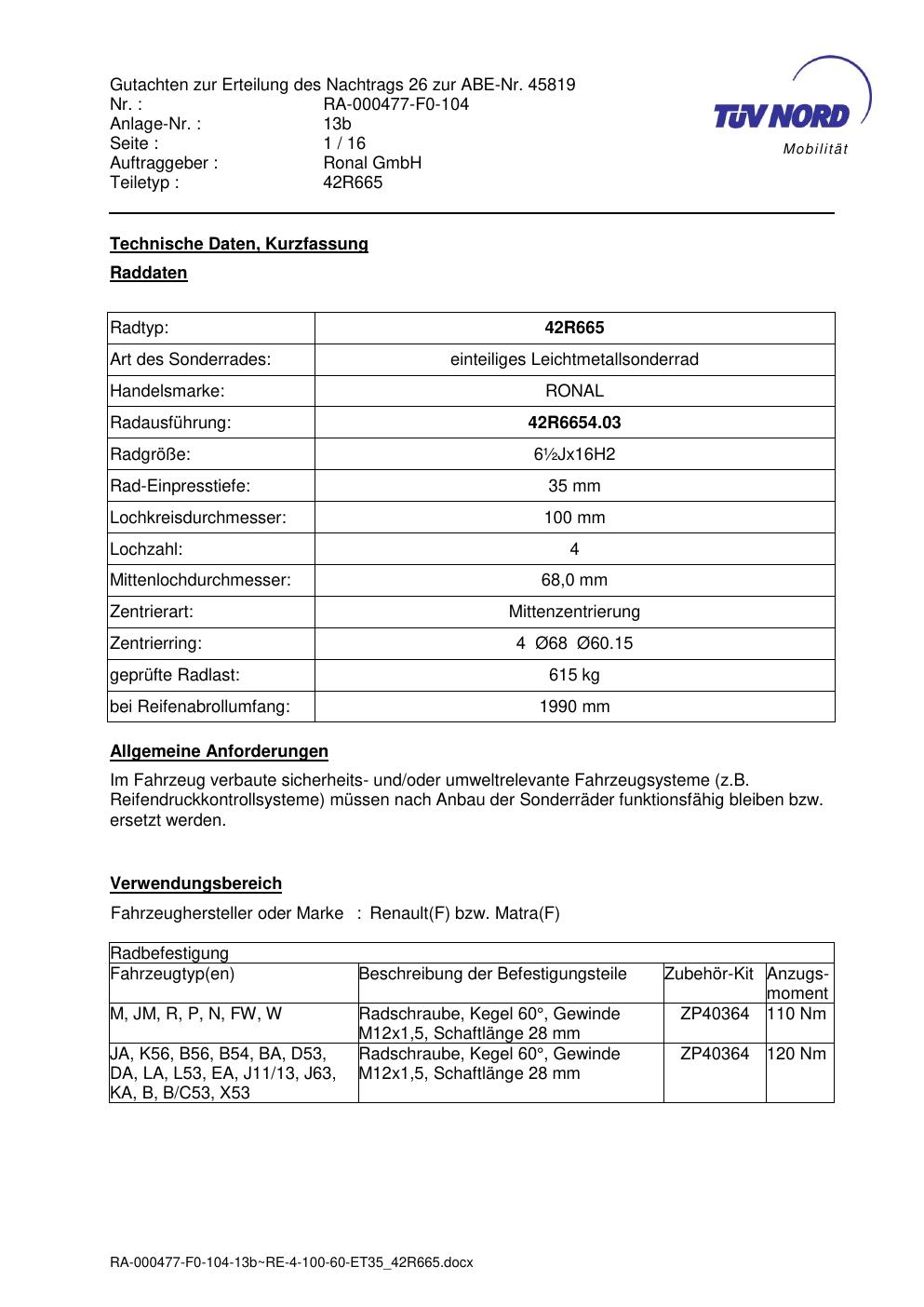 Diese Allgemeine Betriebserlaubnis (ABE) bezieht sich auf die Felge Ronal 42R665 in der Ausführung ET0 mit der KBA 45819. Eine ABE ist eine bauartspezifische Genehmigung, die der Hersteller beim Kraftfahrt-Bundesamt (KBA) erwirkt hat. Sie erlaubt die Verwendung der Felge an den im Dokument genannten Fahrzeugen ohne zusätzliche Einzelabnahme, solange sämtliche im Gutachten aufgeführten Auflagen eingehalten werden.
