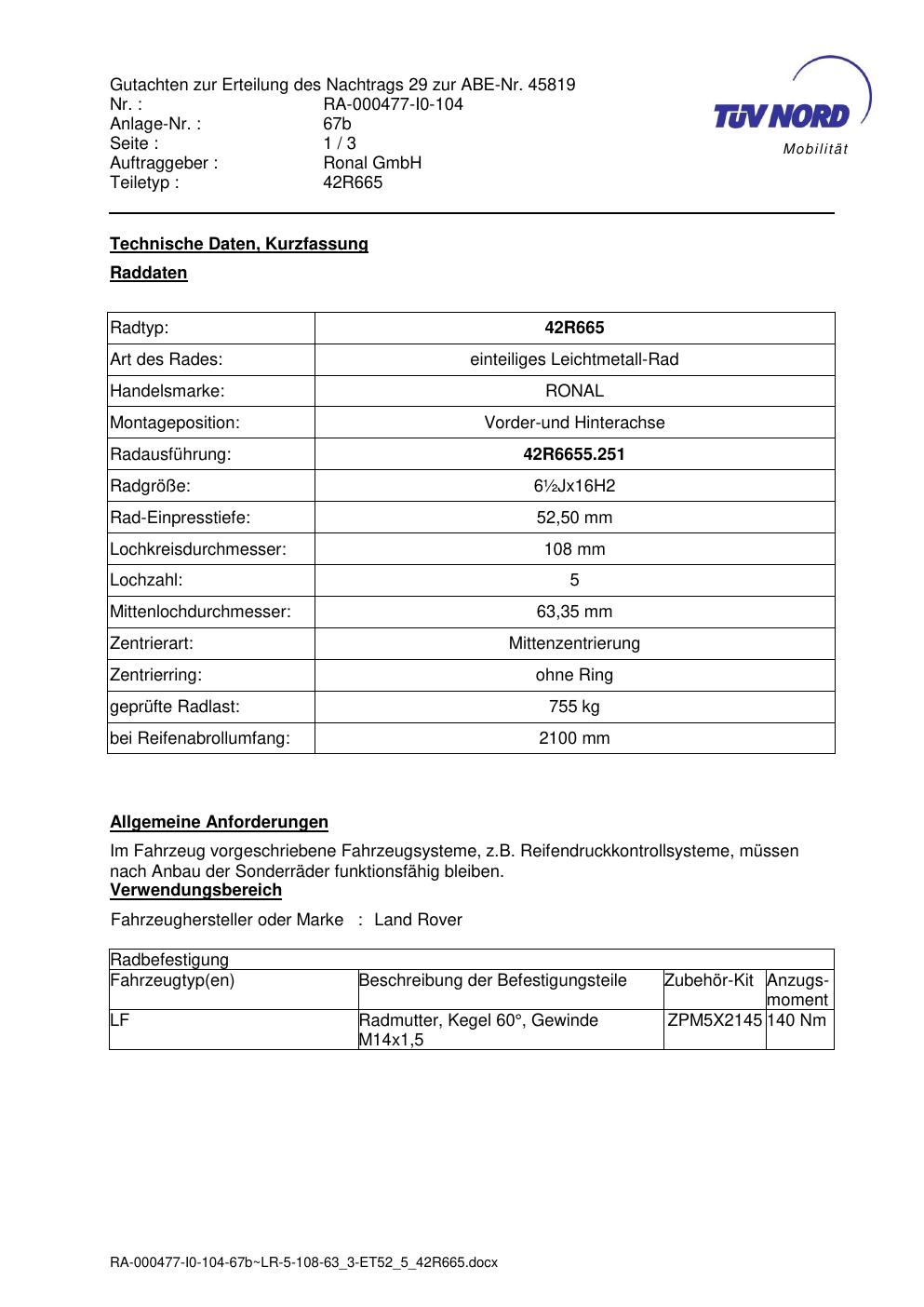 • Stimmt die KBA-Nummer auf der Felge mit diesem Dokument überein?