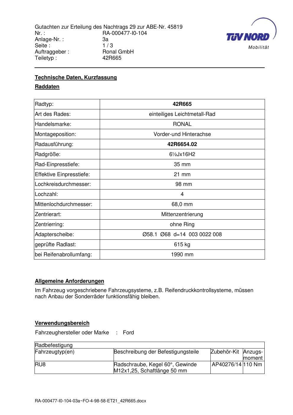 • Stimmt die KBA-Nummer auf der Felge mit diesem Dokument überein?