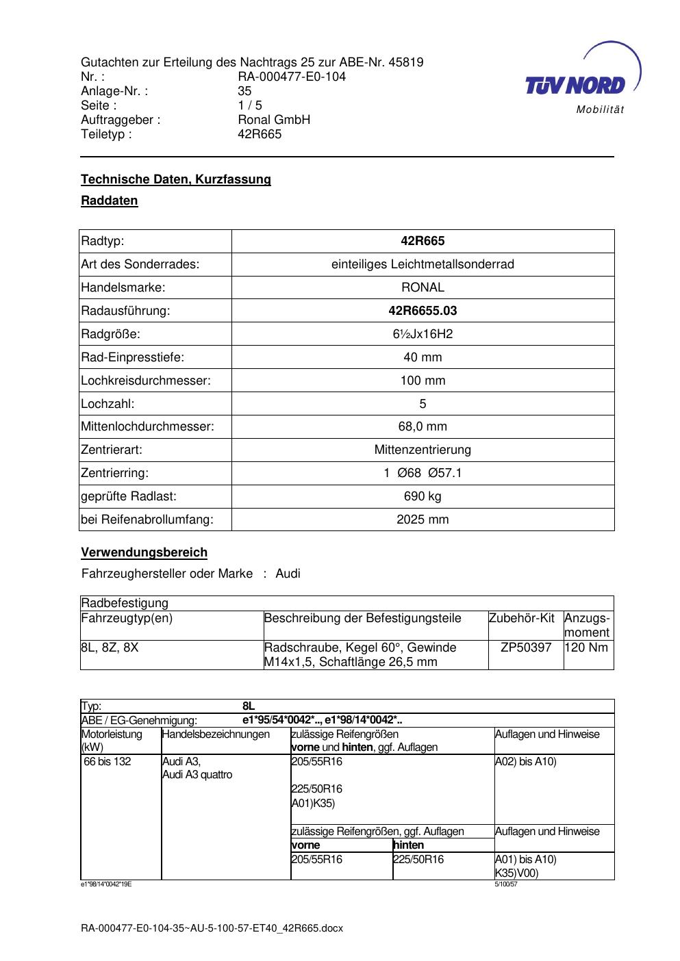Dieses abe gehört zur Felge Ronal 42R665 in ET0 mit KBA 45819. Die Seite ist dafür gedacht, dass du schnell prüfen kannst, ob KBA, Design und Größe zu deiner Felge passen und danach direkt das richtige PDF lädst.