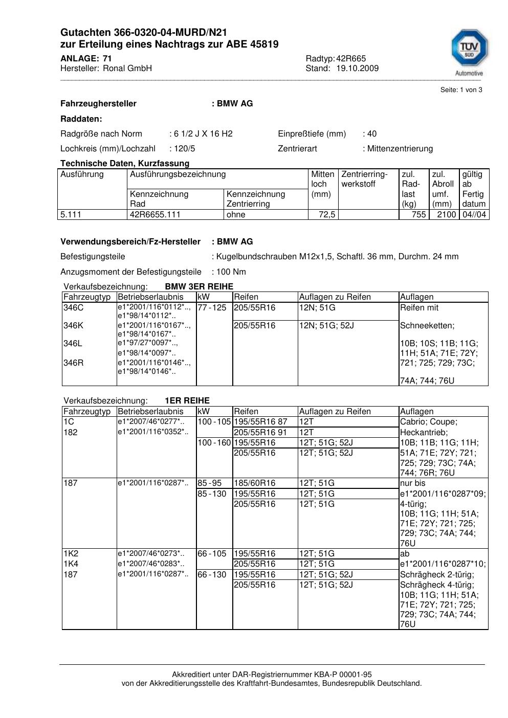 Dieses Gutachten (abe) bezieht sich auf die Alufelge Ronal 42R665 in der Ausführung 2Jx16 ET 0, Mittenloch 0 mm (KBA 45819). Im PDF findest du typischerweise zulässige Reifengrößen, Auflagen/Anbauhinweise und – je nach Dokument – Hinweise zur Eintragung.