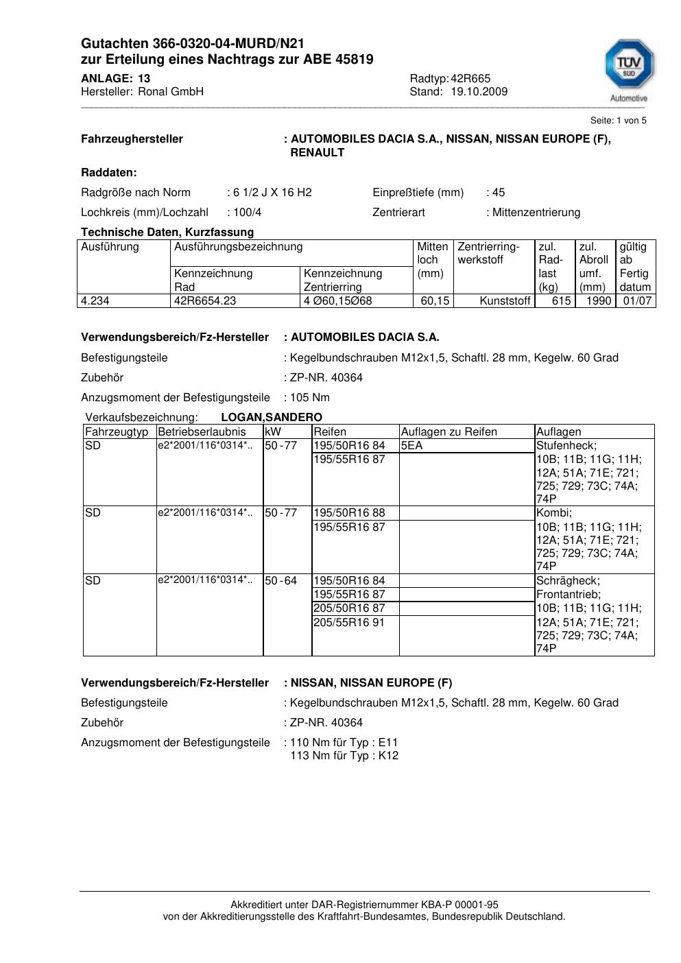 Dieses Gutachten (abe) bezieht sich auf die Alufelge Ronal 42R665 in der Ausführung 2Jx16 ET 0, Mittenloch 0 mm (KBA 45819). Im PDF findest du typischerweise zulässige Reifengrößen, Auflagen/Anbauhinweise und – je nach Dokument – Hinweise zur Eintragung.