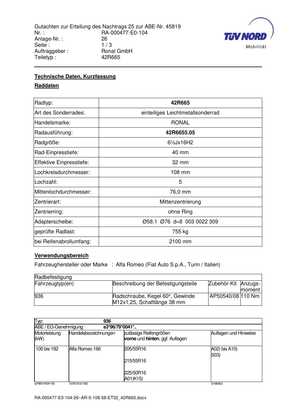 Diese Allgemeine Betriebserlaubnis (ABE) bezieht sich auf die Felge Ronal 42R665 in der Ausführung ET0 mit der KBA 45819. Eine ABE ist eine bauartspezifische Genehmigung, die der Hersteller beim Kraftfahrt-Bundesamt (KBA) erwirkt hat. Sie erlaubt die Verwendung der Felge an den im Dokument genannten Fahrzeugen ohne zusätzliche Einzelabnahme, solange sämtliche im Gutachten aufgeführten Auflagen eingehalten werden.