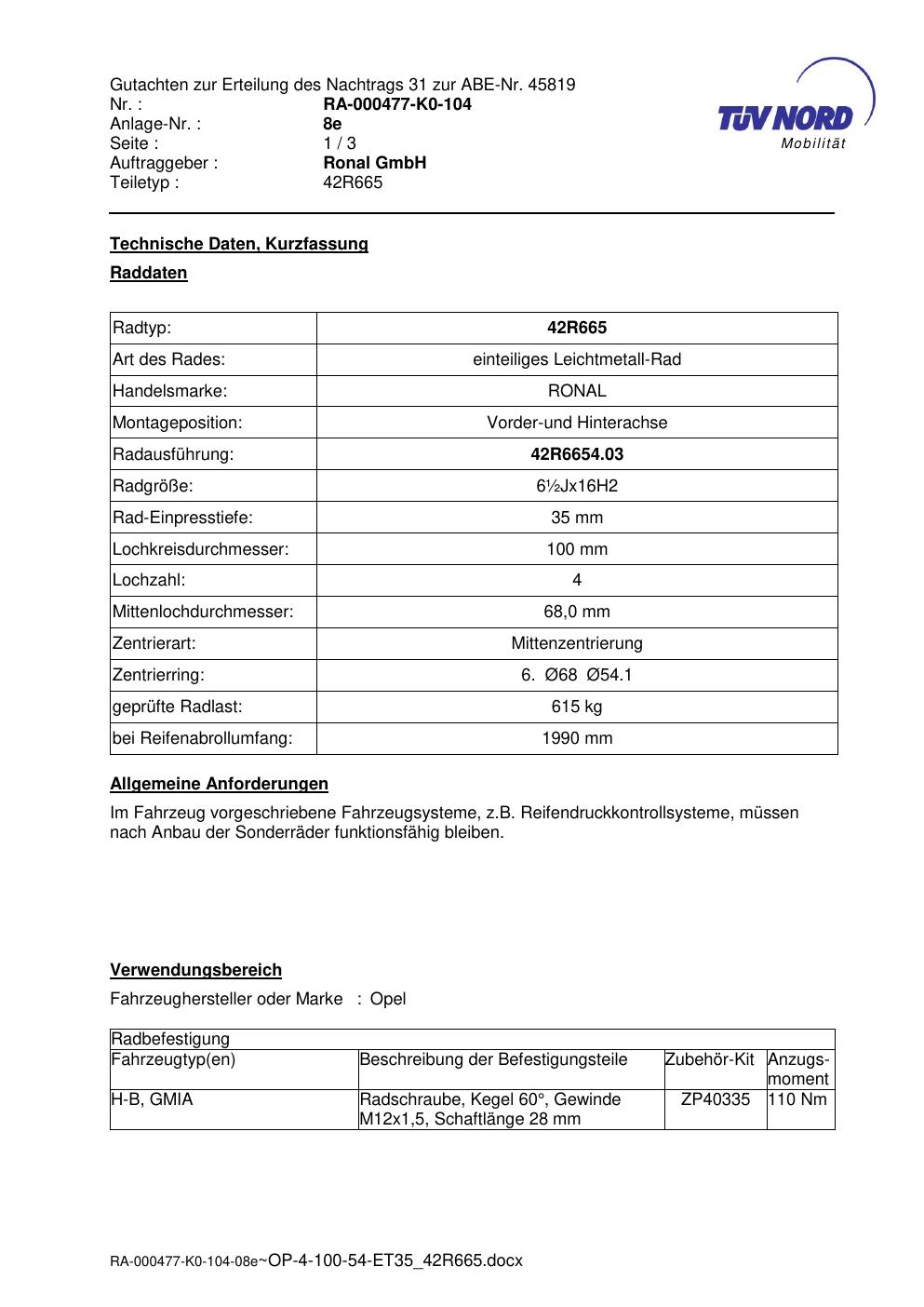 • Stimmt die KBA-Nummer auf der Felge mit diesem Dokument überein?