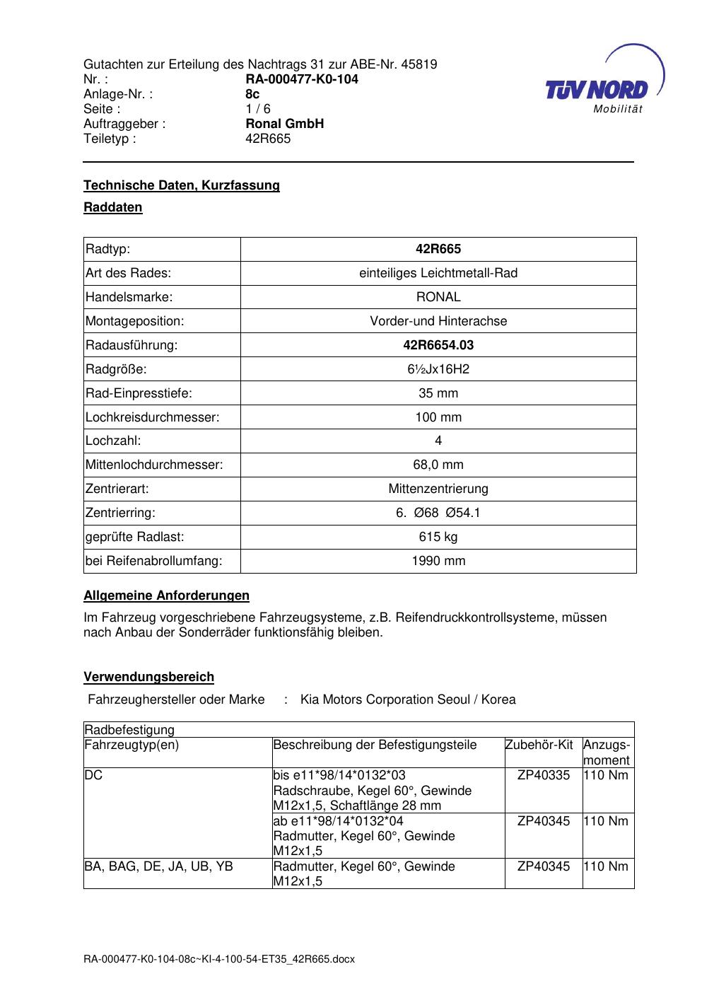 • Stimmt die KBA-Nummer auf der Felge mit diesem Dokument überein?