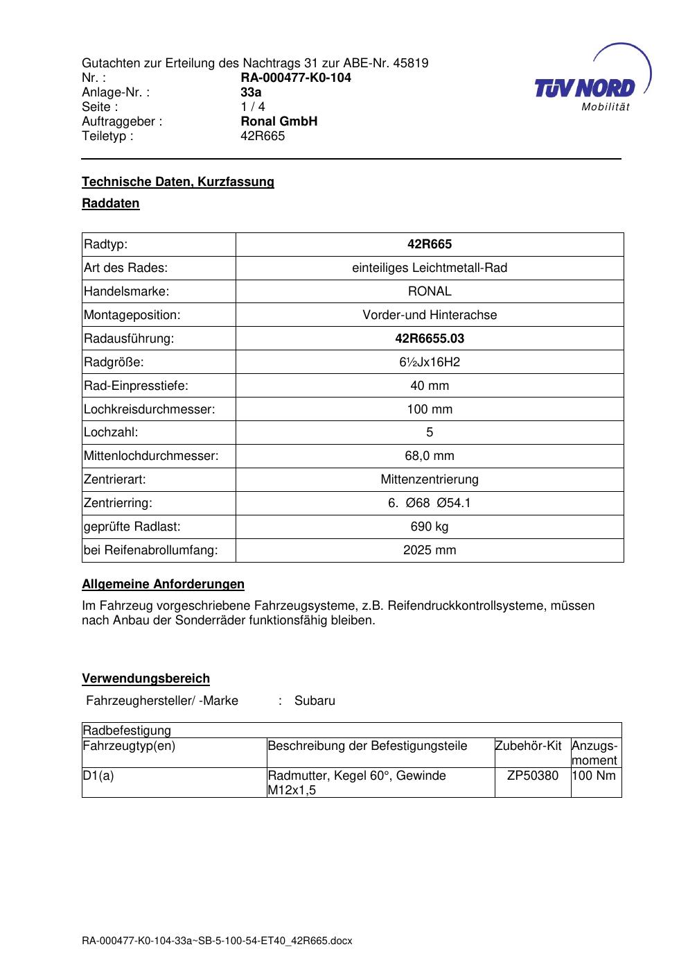 • Stimmt die KBA-Nummer auf der Felge mit diesem Dokument überein?