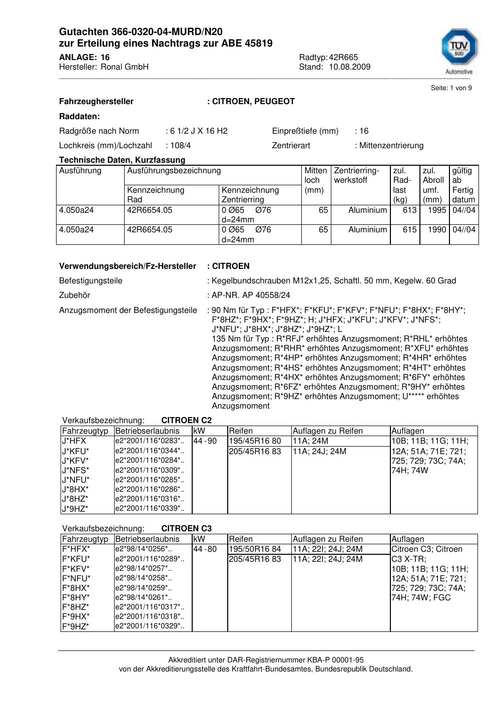 Diese Allgemeine Betriebserlaubnis (ABE) bezieht sich auf die Felge Ronal 42R665 in der Ausführung 2Jx16 ET0 mit der KBA 45819. Eine ABE ist eine bauartspezifische Genehmigung, die der Hersteller beim Kraftfahrt-Bundesamt (KBA) erwirkt hat. Sie erlaubt die Verwendung der Felge an den im Dokument genannten Fahrzeugen ohne zusätzliche Einzelabnahme, solange sämtliche im Gutachten aufgeführten Auflagen eingehalten werden.