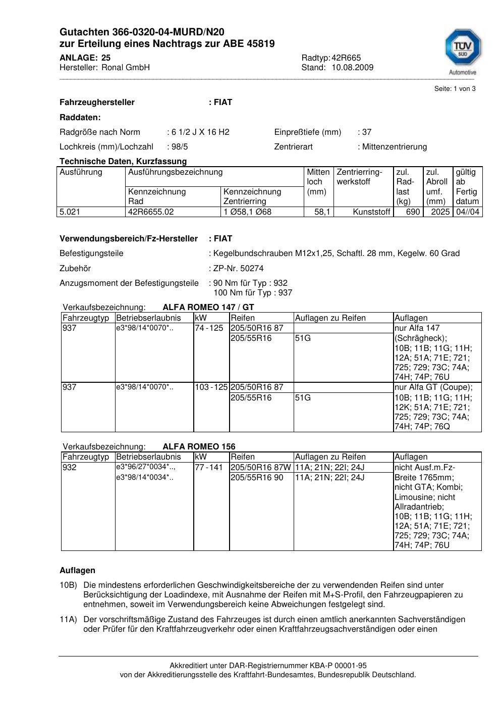 Dieses Gutachten (abe) bezieht sich auf die Alufelge Ronal 42R665 in der Ausführung 2Jx16 ET 0, Mittenloch 0 mm (KBA 45819). Im PDF findest du typischerweise zulässige Reifengrößen, Auflagen/Anbauhinweise und – je nach Dokument – Hinweise zur Eintragung.