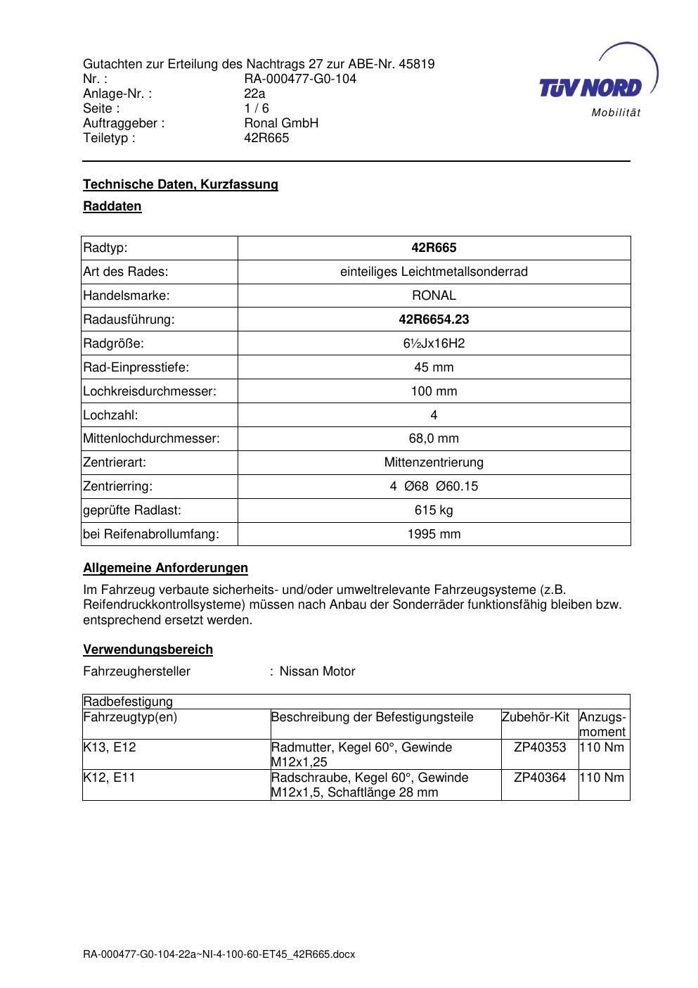• Stimmt die KBA-Nummer auf der Felge mit diesem Dokument überein?