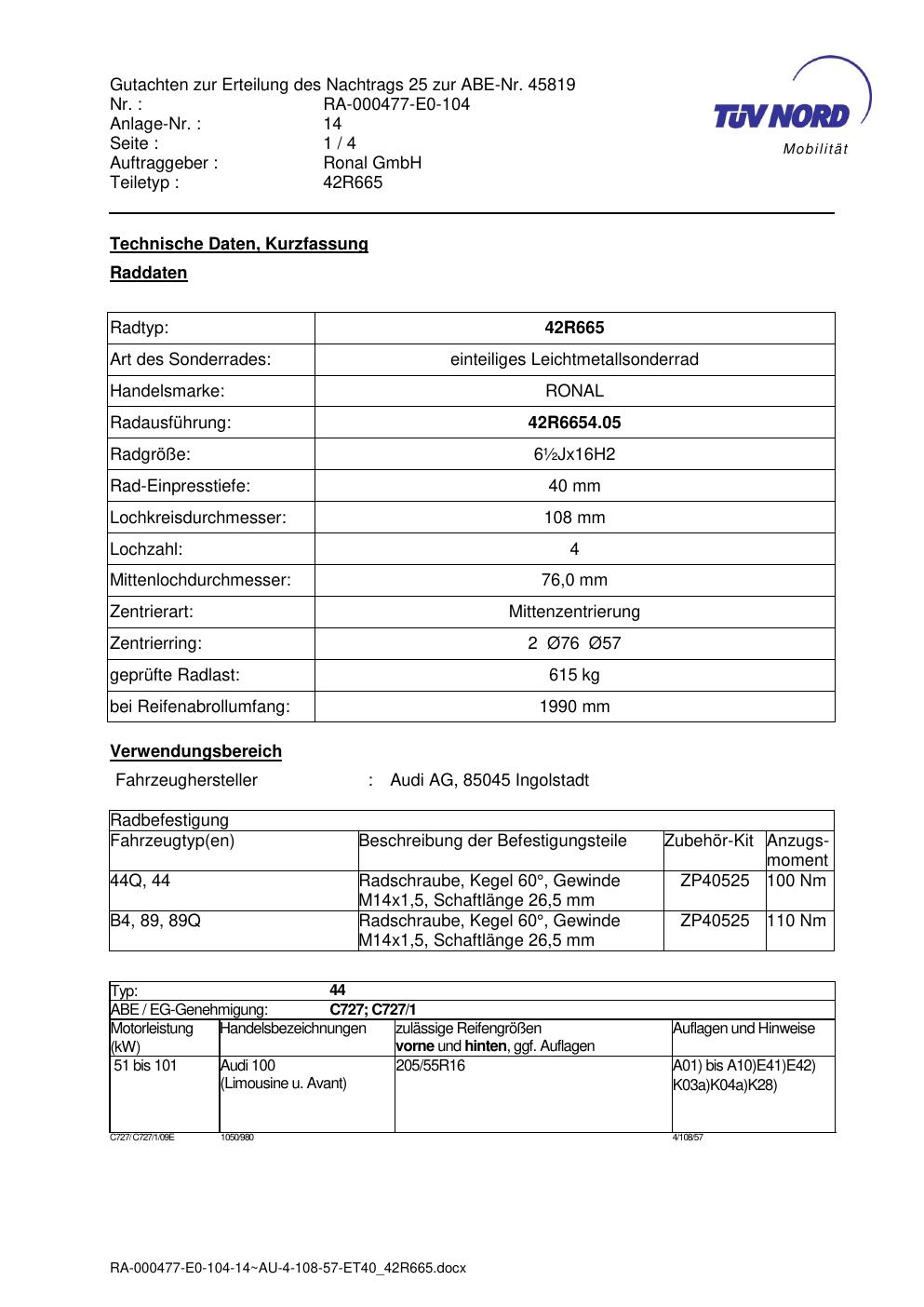 Dieses abe gehört zur Felge Ronal 42R665 in 7Jx15 ET0 mit KBA 45819. Die Seite ist dafür gedacht, dass du schnell prüfen kannst, ob KBA, Design und Größe zu deiner Felge passen und danach direkt das richtige PDF lädst.