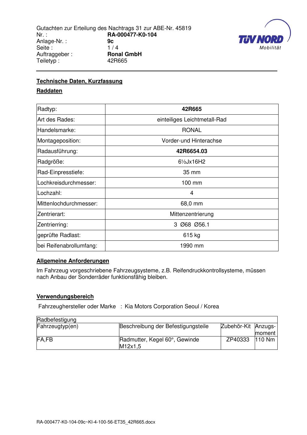 • Stimmt die KBA-Nummer auf der Felge mit diesem Dokument überein?