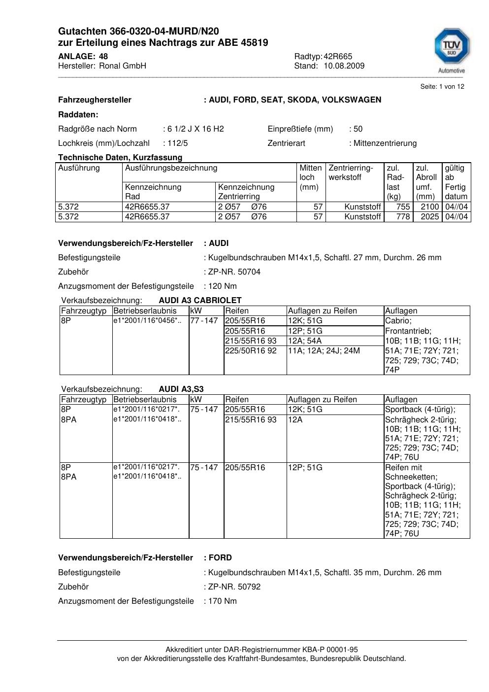 Fahrzeughersteller: AUDI, FORD, SEAT, SKODA, VOLKSWAGEN, VW