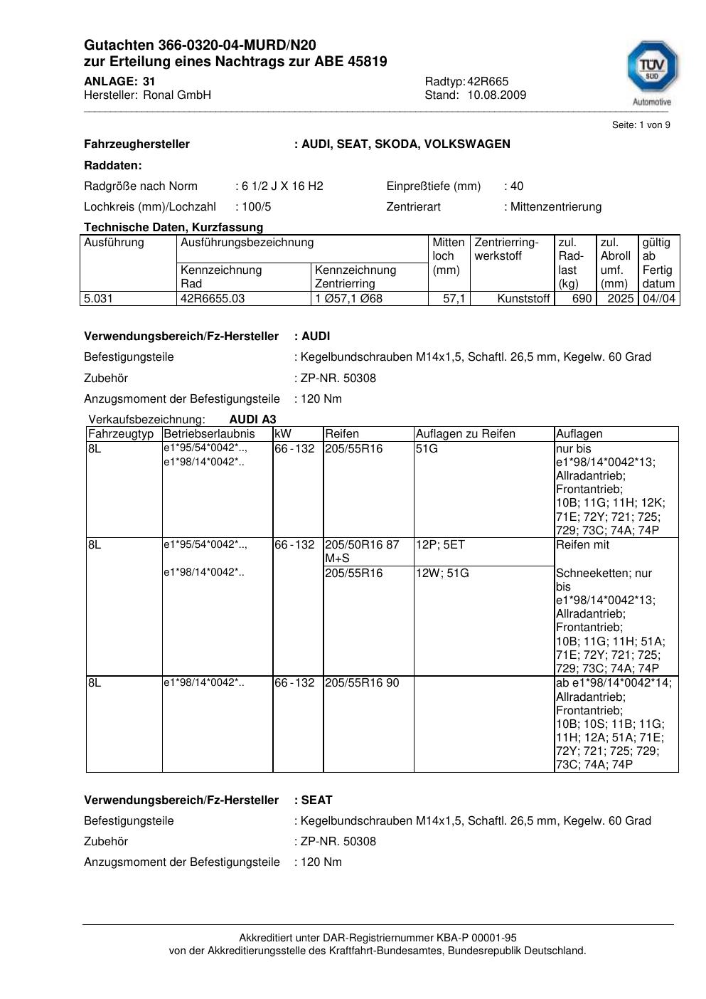 Dieses Gutachten (abe) bezieht sich auf die Alufelge Ronal 42R665 in der Ausführung 2Jx16 ET 0, Mittenloch 0 mm (KBA 45819). Im PDF findest du typischerweise zulässige Reifengrößen, Auflagen/Anbauhinweise und – je nach Dokument – Hinweise zur Eintragung.
