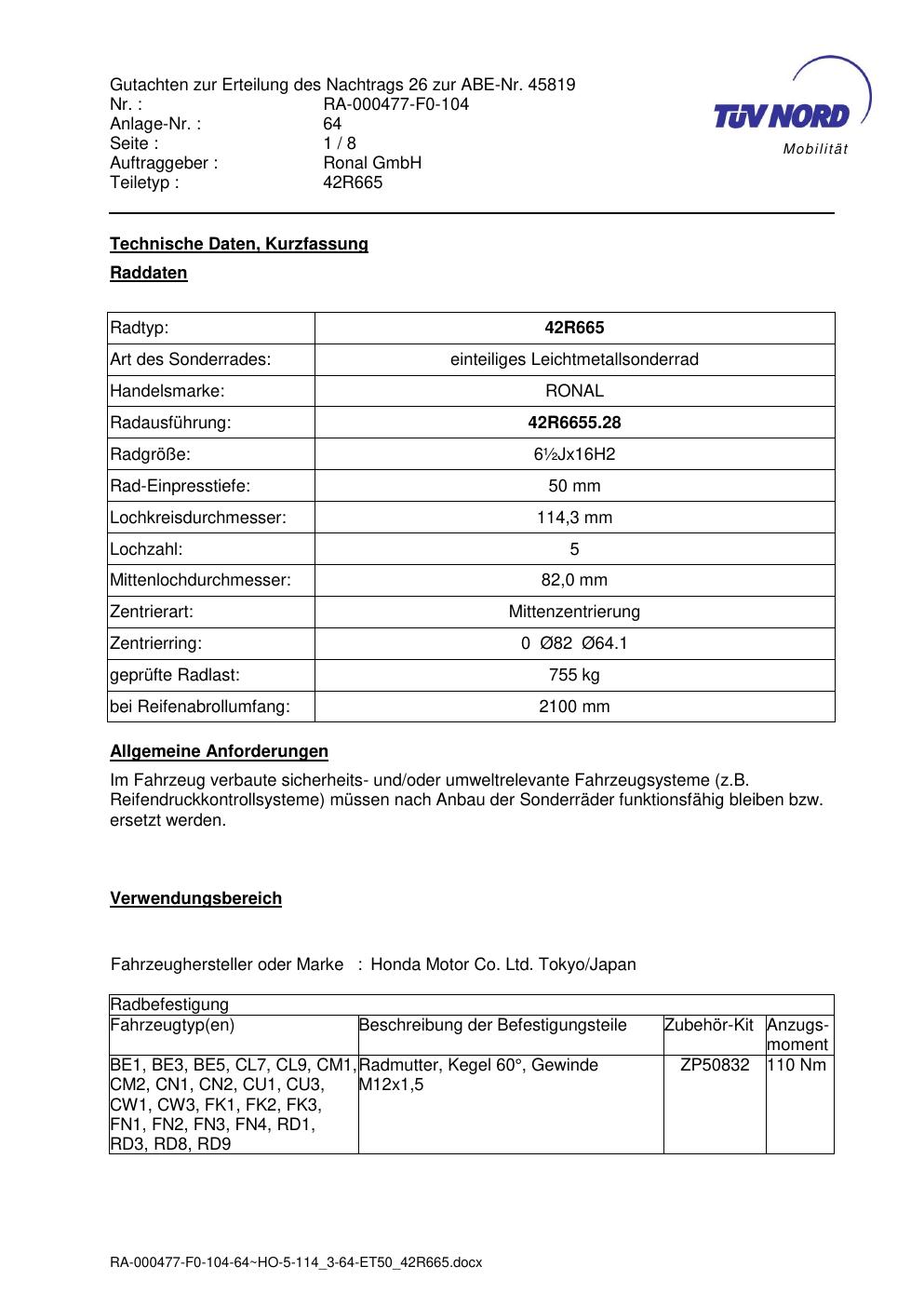 • Stimmt die KBA-Nummer auf der Felge mit diesem Dokument überein?