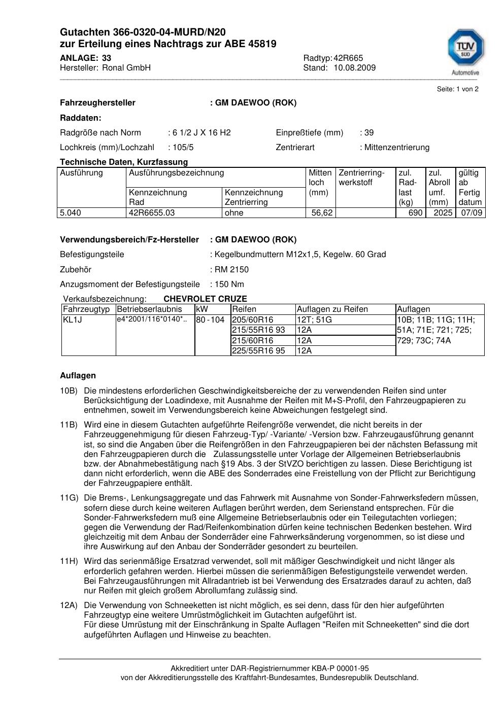Dieses Gutachten (abe) bezieht sich auf die Alufelge Ronal 42R665 in der Ausführung 2Jx16 ET 0, Mittenloch 0 mm (KBA 45819). Im PDF findest du typischerweise zulässige Reifengrößen, Auflagen/Anbauhinweise und – je nach Dokument – Hinweise zur Eintragung.