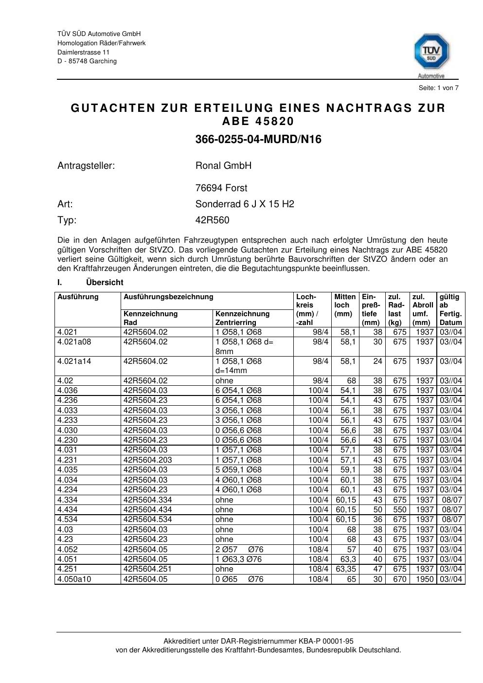 Dieses Gutachten (abe) bezieht sich auf die Alufelge ATS 42R560 in der Ausführung 6Jx15 ET 0, Mittenloch 0 mm (KBA 45820). Im PDF findest du typischerweise zulässige Reifengrößen, Auflagen/Anbauhinweise und – je nach Dokument – Hinweise zur Eintragung.