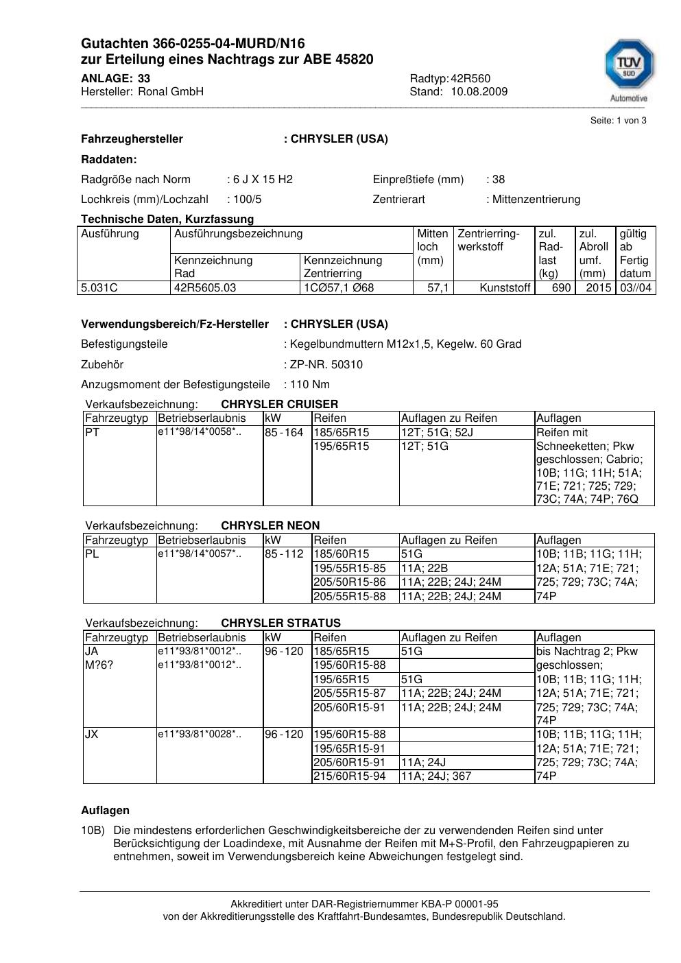 Dieses Gutachten (abe) bezieht sich auf die Alufelge Ronal 42R560 in der Ausführung 6Jx15 ET 0, Mittenloch 0 mm (KBA 45820). Im PDF findest du typischerweise zulässige Reifengrößen, Auflagen/Anbauhinweise und – je nach Dokument – Hinweise zur Eintragung.
