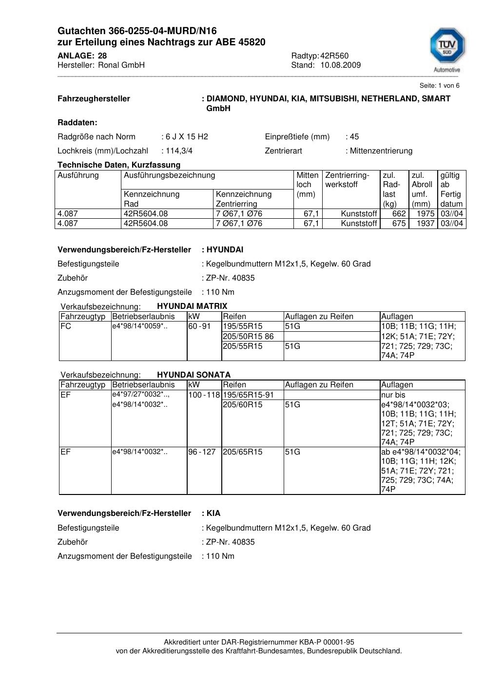 Dieses Gutachten (abe) bezieht sich auf die Alufelge Ronal 42R560 in der Ausführung 6Jx15 ET 0, Mittenloch 0 mm (KBA 45820). Im PDF findest du typischerweise zulässige Reifengrößen, Auflagen/Anbauhinweise und – je nach Dokument – Hinweise zur Eintragung.