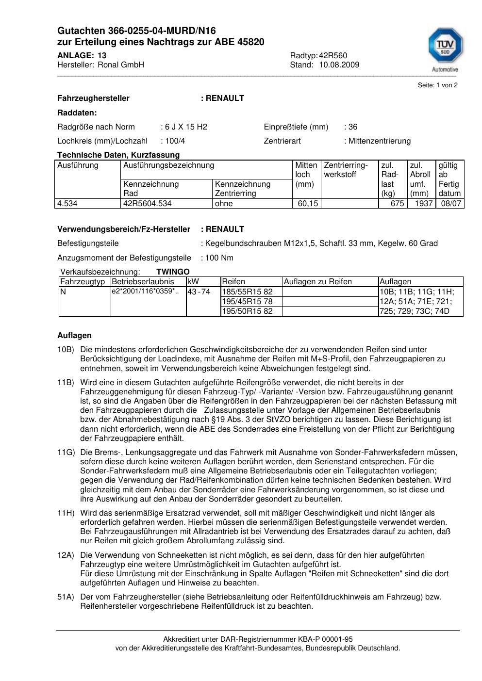 Dieses Gutachten (abe) bezieht sich auf die Alufelge Ronal 42R560 in der Ausführung 6Jx15 ET 0, Mittenloch 0 mm (KBA 45820). Im PDF findest du typischerweise zulässige Reifengrößen, Auflagen/Anbauhinweise und – je nach Dokument – Hinweise zur Eintragung.
