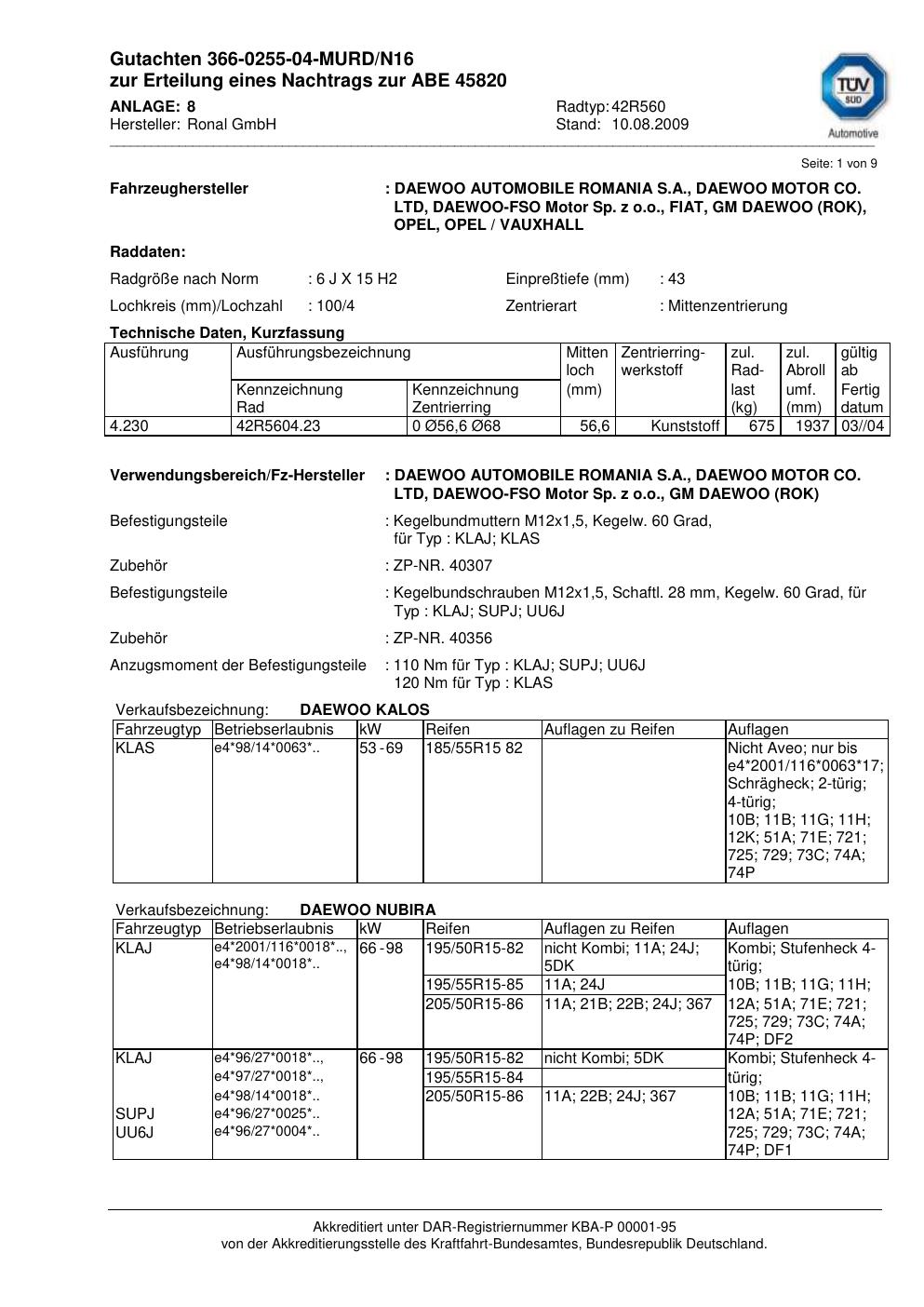 Dieses Gutachten (abe) bezieht sich auf die Alufelge Ronal 42R560 in der Ausführung 6Jx15 ET 0, Mittenloch 0 mm (KBA 45820). Im PDF findest du typischerweise zulässige Reifengrößen, Auflagen/Anbauhinweise und – je nach Dokument – Hinweise zur Eintragung.