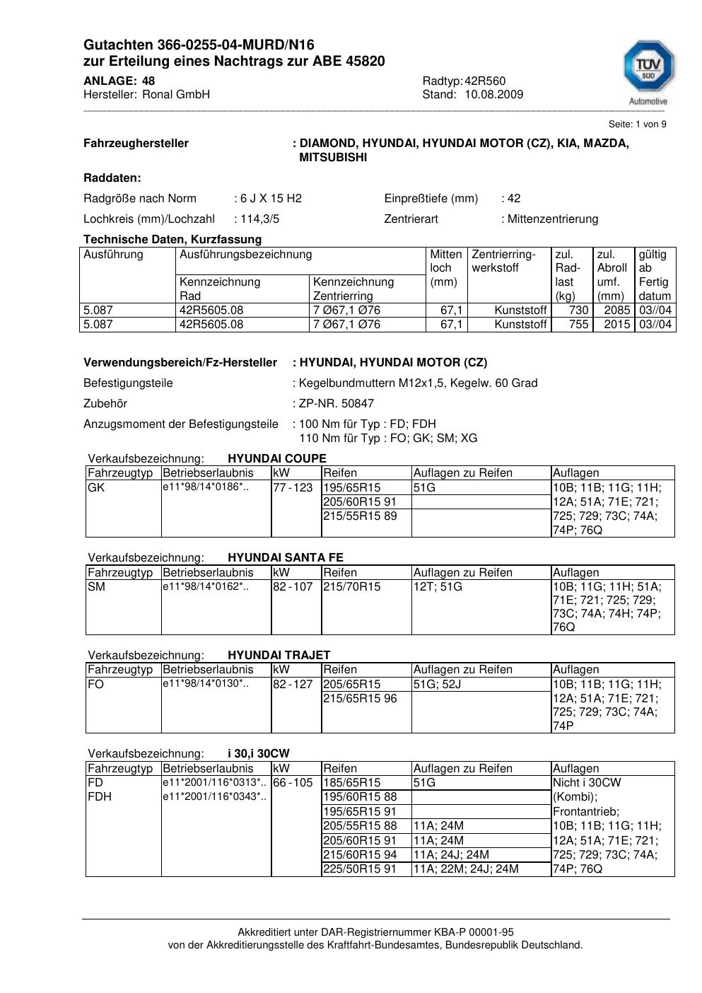 Dieses Gutachten (abe) bezieht sich auf die Alufelge Ronal 42R560 in der Ausführung 6Jx15 ET 0, Mittenloch 0 mm (KBA 45820). Im PDF findest du typischerweise zulässige Reifengrößen, Auflagen/Anbauhinweise und – je nach Dokument – Hinweise zur Eintragung.