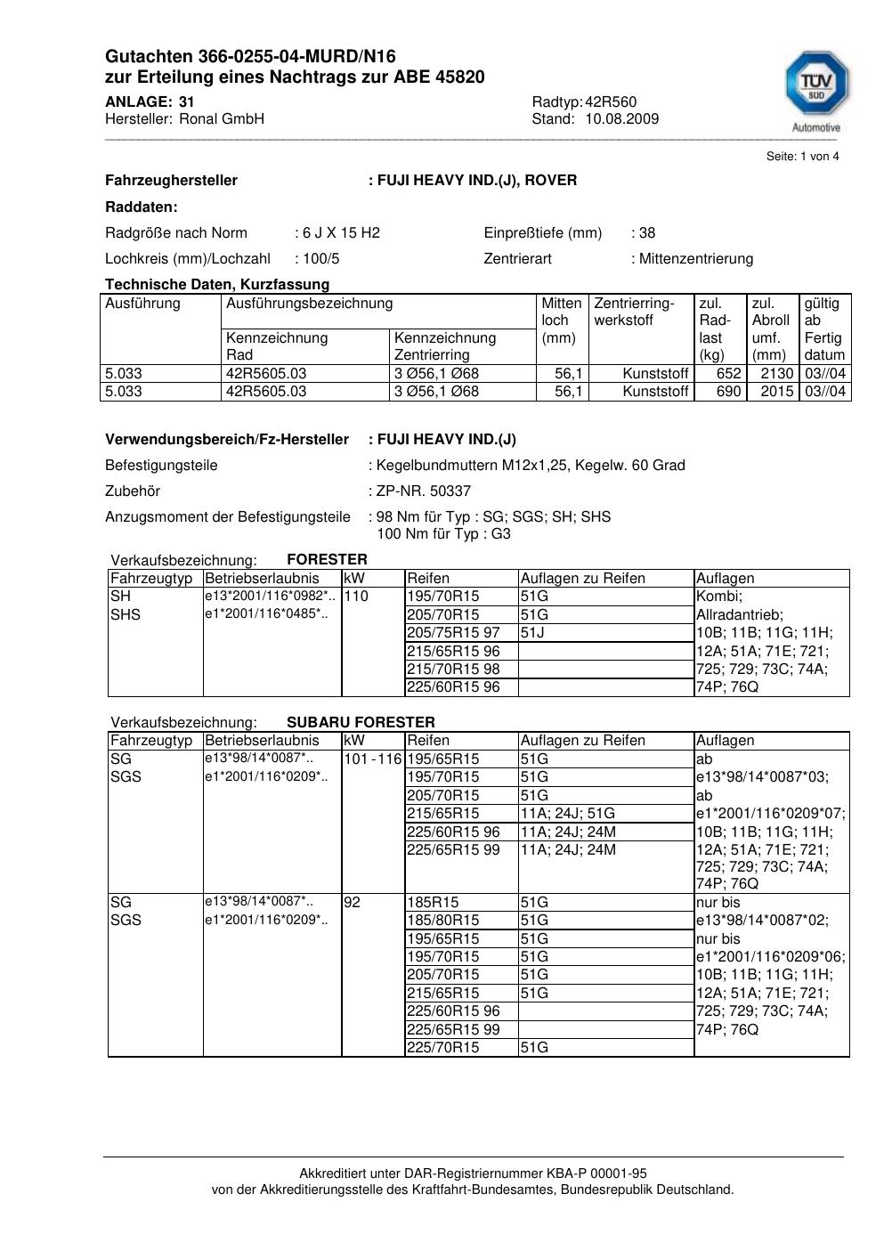 Dieses Gutachten (abe) bezieht sich auf die Alufelge Ronal 42R560 in der Ausführung 6Jx15 ET 0, Mittenloch 0 mm (KBA 45820). Im PDF findest du typischerweise zulässige Reifengrößen, Auflagen/Anbauhinweise und – je nach Dokument – Hinweise zur Eintragung.