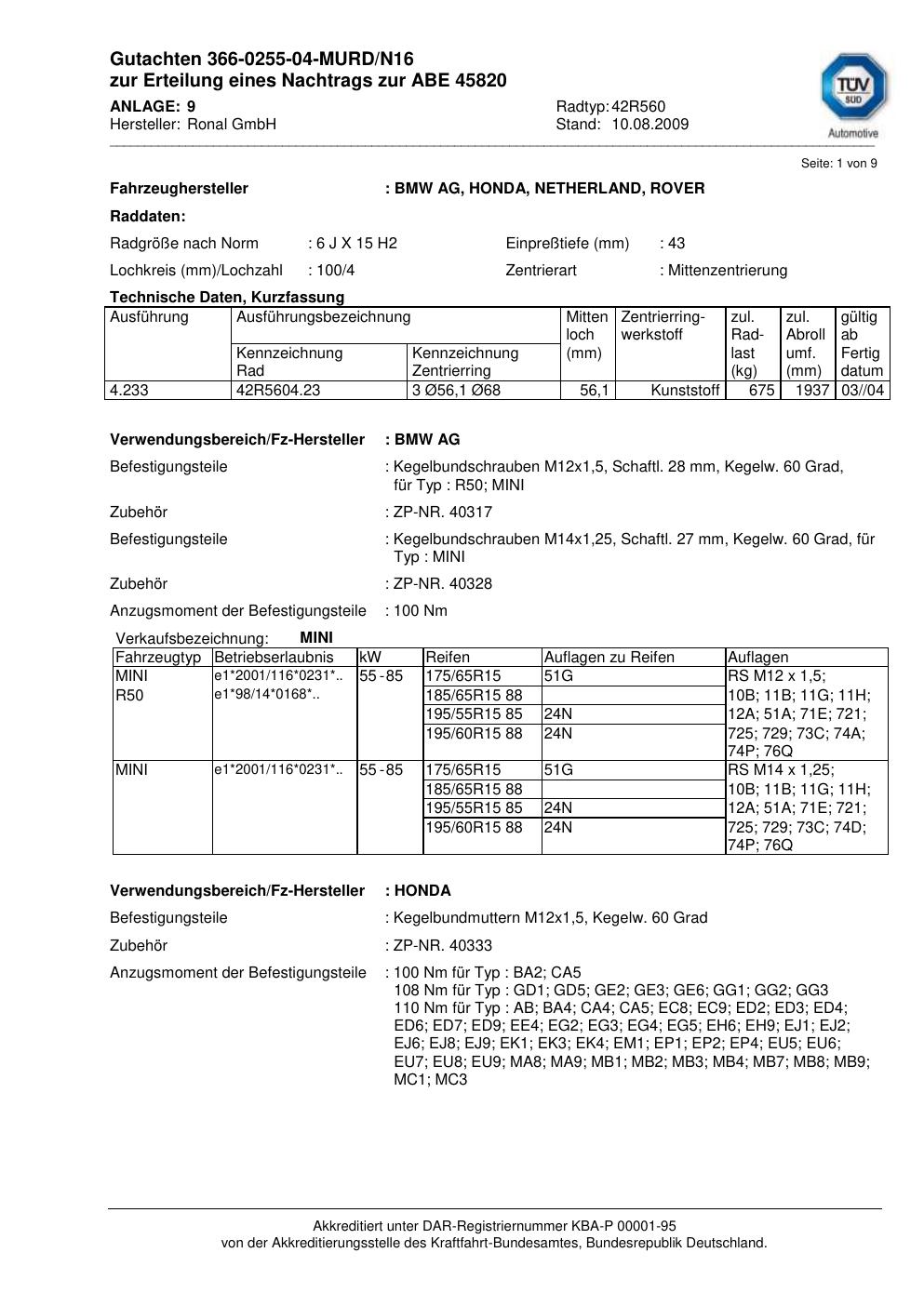 Dieses Gutachten (abe) bezieht sich auf die Alufelge Ronal 42R560 in der Ausführung 6Jx15 ET 0, Mittenloch 0 mm (KBA 45820). Im PDF findest du typischerweise zulässige Reifengrößen, Auflagen/Anbauhinweise und – je nach Dokument – Hinweise zur Eintragung.