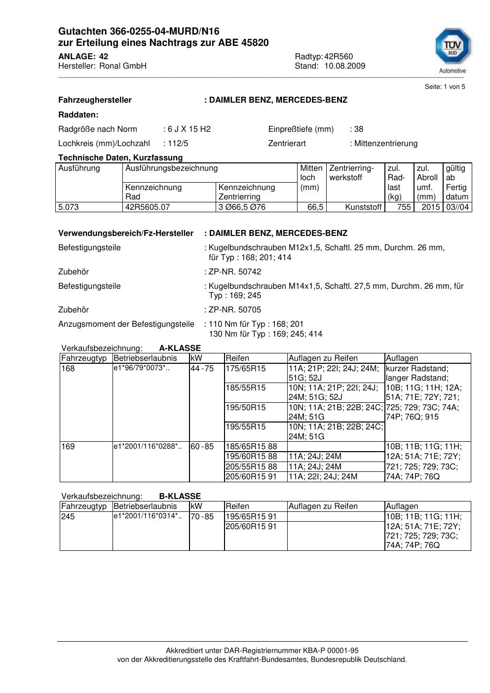 Dieses Gutachten (abe) bezieht sich auf die Alufelge Ronal 42R560 in der Ausführung 6Jx15 ET 0, Mittenloch 0 mm (KBA 45820). Im PDF findest du typischerweise zulässige Reifengrößen, Auflagen/Anbauhinweise und – je nach Dokument – Hinweise zur Eintragung.
