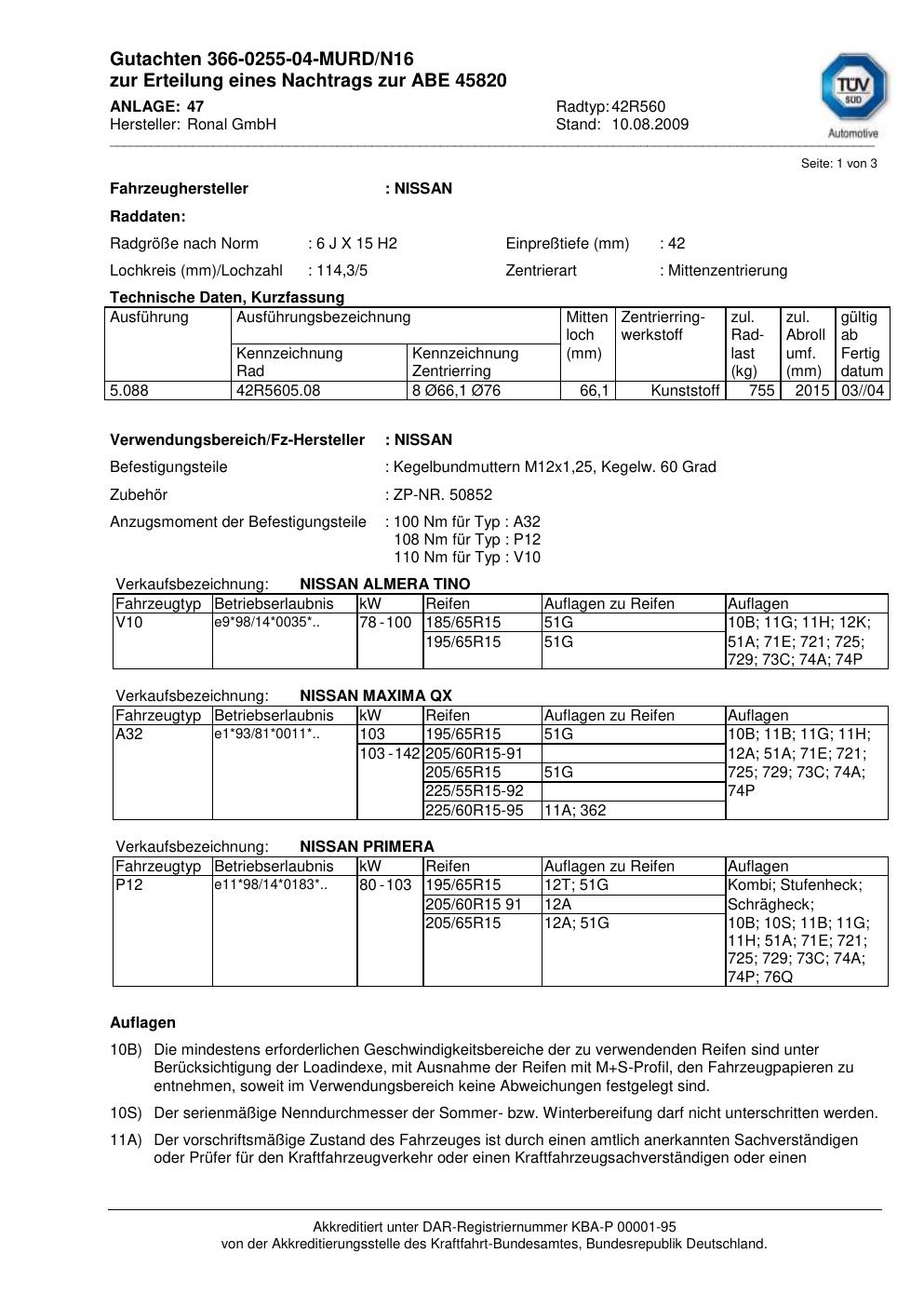 Dieses Gutachten (abe) bezieht sich auf die Alufelge Ronal 42R560 in der Ausführung 6Jx15 ET 0, Mittenloch 0 mm (KBA 45820). Im PDF findest du typischerweise zulässige Reifengrößen, Auflagen/Anbauhinweise und – je nach Dokument – Hinweise zur Eintragung.