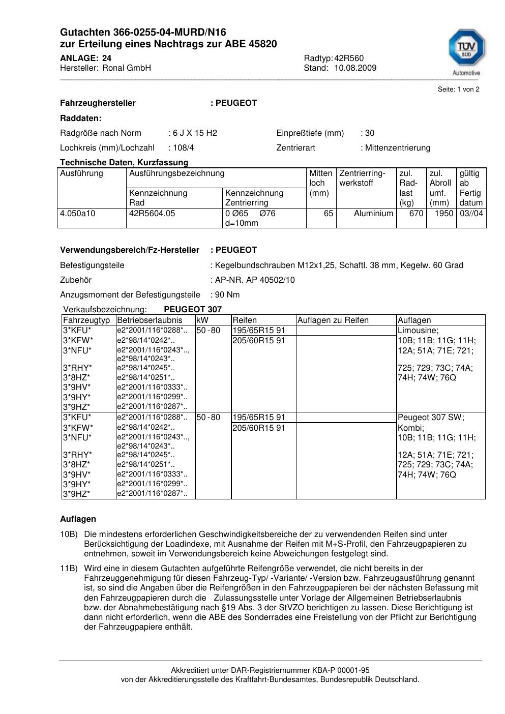 Dieses Gutachten (abe) bezieht sich auf die Alufelge brand-ronal 42R560 in der Ausführung 6Jx15 ET 0, Mittenloch 0 mm (KBA 45820). Im PDF findest du typischerweise zulässige Reifengrößen, Auflagen/Anbauhinweise und – je nach Dokument – Hinweise zur Eintragung.