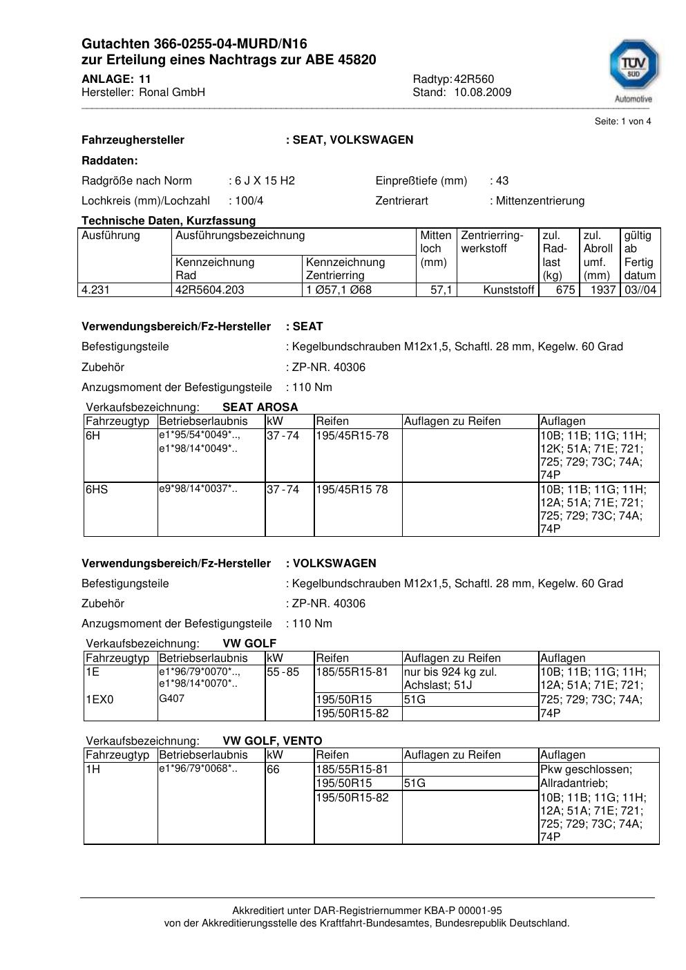 Dieses Gutachten (abe) bezieht sich auf die Alufelge Ronal 42R560 in der Ausführung 6Jx15 ET 0, Mittenloch 0 mm (KBA 45820). Im PDF findest du typischerweise zulässige Reifengrößen, Auflagen/Anbauhinweise und – je nach Dokument – Hinweise zur Eintragung.