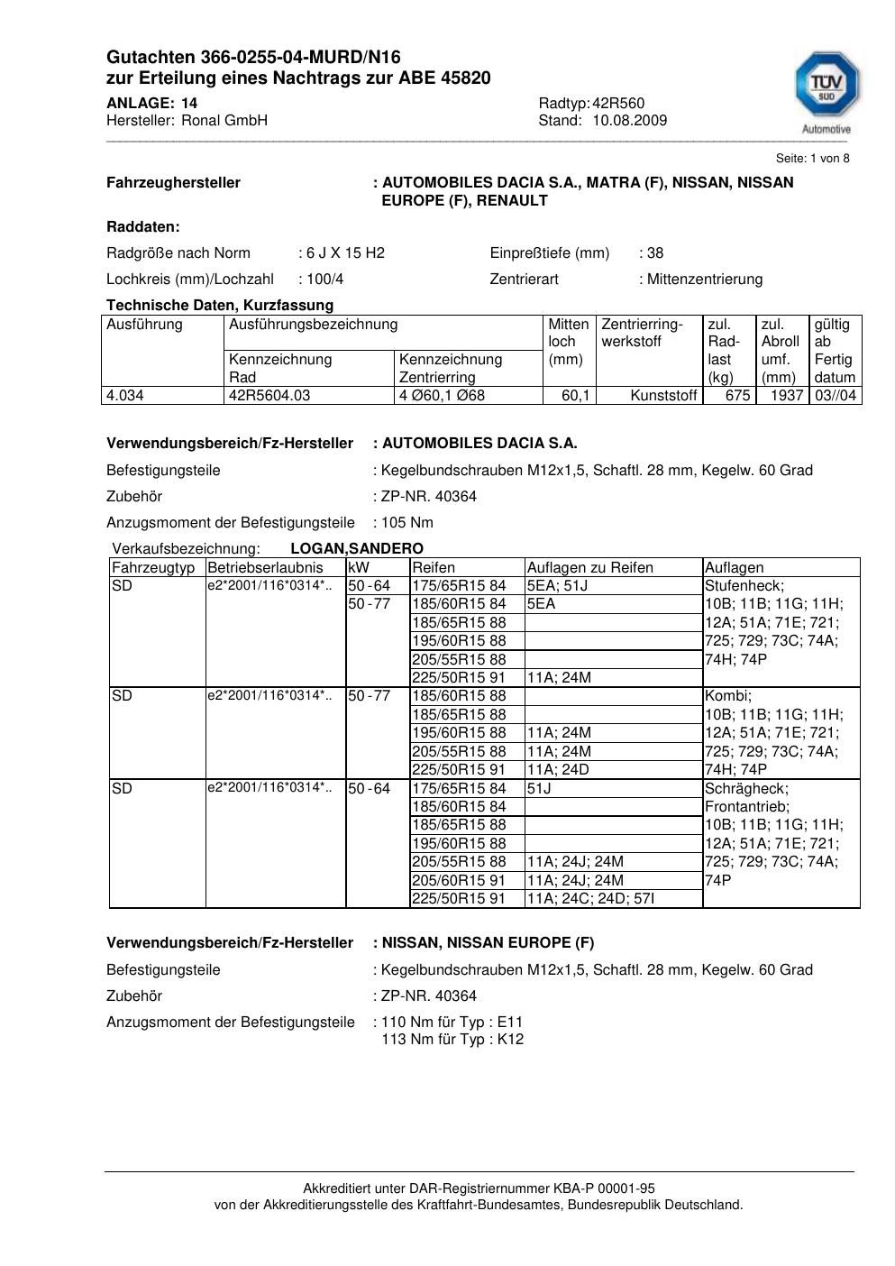 Dieses Gutachten (abe) bezieht sich auf die Alufelge Ronal 42R560 in der Ausführung 6Jx15 ET 0, Mittenloch 0 mm (KBA 45820). Im PDF findest du typischerweise zulässige Reifengrößen, Auflagen/Anbauhinweise und – je nach Dokument – Hinweise zur Eintragung.