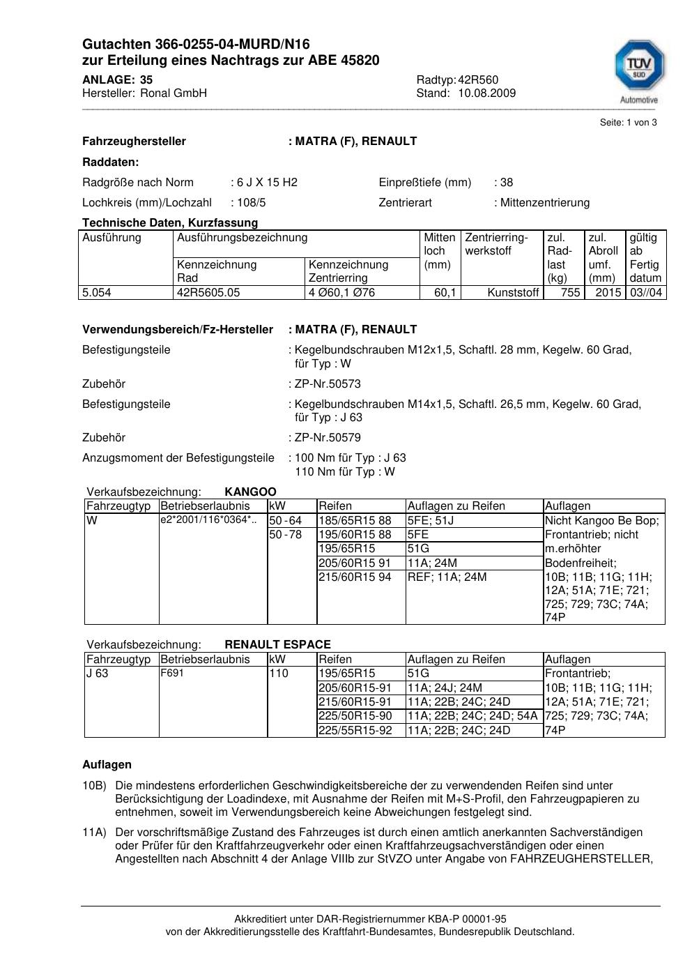 Dieses Gutachten (abe) bezieht sich auf die Alufelge Ronal 42R560 in der Ausführung 6Jx15 ET 0, Mittenloch 0 mm (KBA 45820). Im PDF findest du typischerweise zulässige Reifengrößen, Auflagen/Anbauhinweise und – je nach Dokument – Hinweise zur Eintragung.
