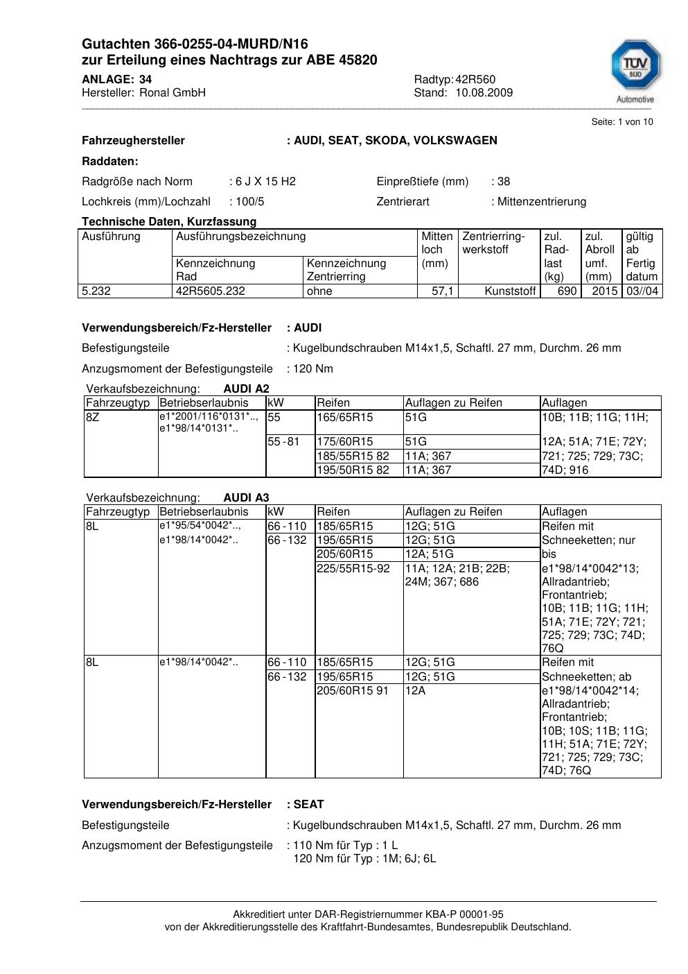 Dieses Gutachten (abe) bezieht sich auf die Alufelge Ronal 42R560 in der Ausführung 6Jx15 ET 0, Mittenloch 0 mm (KBA 45820). Im PDF findest du typischerweise zulässige Reifengrößen, Auflagen/Anbauhinweise und – je nach Dokument – Hinweise zur Eintragung.
