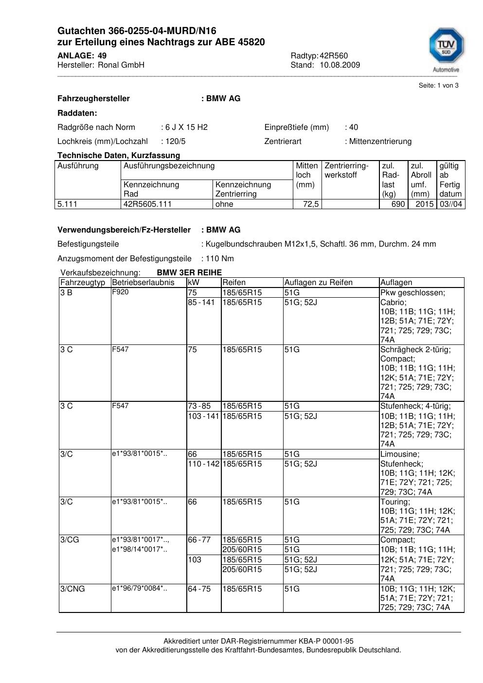 Dieses Gutachten (abe) bezieht sich auf die Alufelge Ronal 42R560 in der Ausführung 6Jx15 ET 0, Mittenloch 0 mm (KBA 45820). Im PDF findest du typischerweise zulässige Reifengrößen, Auflagen/Anbauhinweise und – je nach Dokument – Hinweise zur Eintragung.