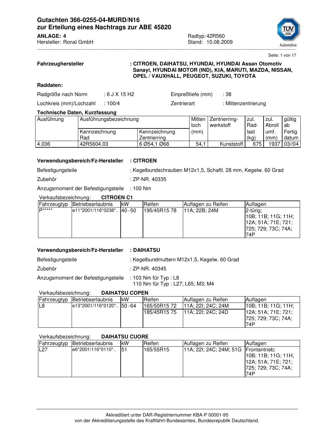 Felgengutachten / abe für Alufelgen Ronal 42R560 (6Jx15 ET 0, Mittenloch 0 mm) mit KBA 45820 (Zertifikatsnummer 45820). Hier kostenlos als PDF herunterladen. Der Download-Link ist 24 Stunden gültig und kann bis zu zwei Mal verwendet werden.