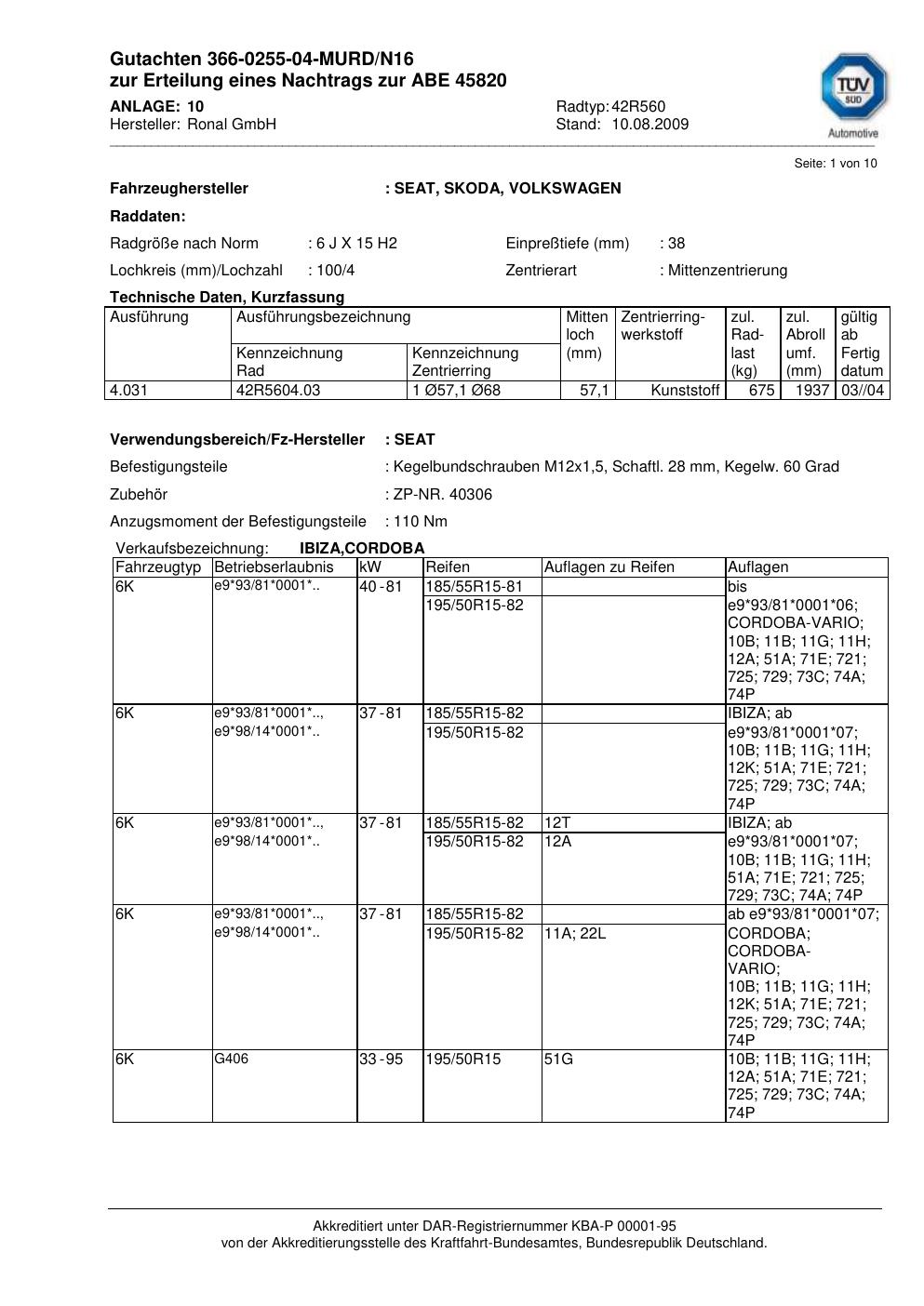 Dieses Gutachten (abe) bezieht sich auf die Alufelge Ronal 42R560 in der Ausführung 6Jx15 ET 0, Mittenloch 0 mm (KBA 45820). Im PDF findest du typischerweise zulässige Reifengrößen, Auflagen/Anbauhinweise und – je nach Dokument – Hinweise zur Eintragung.