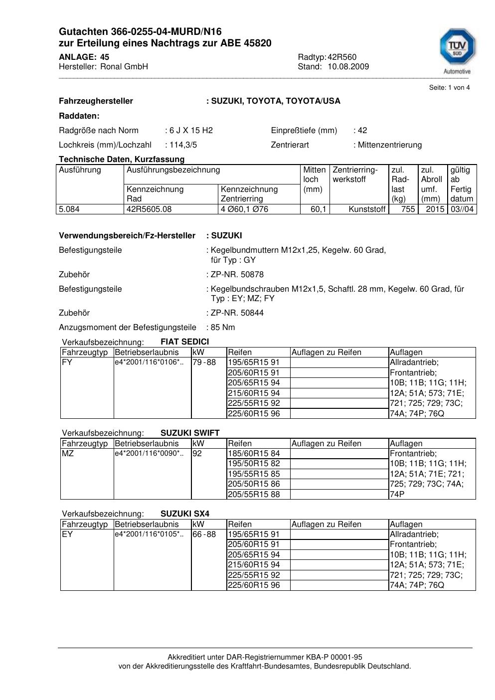 Dieses Gutachten (abe) bezieht sich auf die Alufelge Ronal 42R560 in der Ausführung 6Jx15 ET 0, Mittenloch 0 mm (KBA 45820). Im PDF findest du typischerweise zulässige Reifengrößen, Auflagen/Anbauhinweise und – je nach Dokument – Hinweise zur Eintragung.