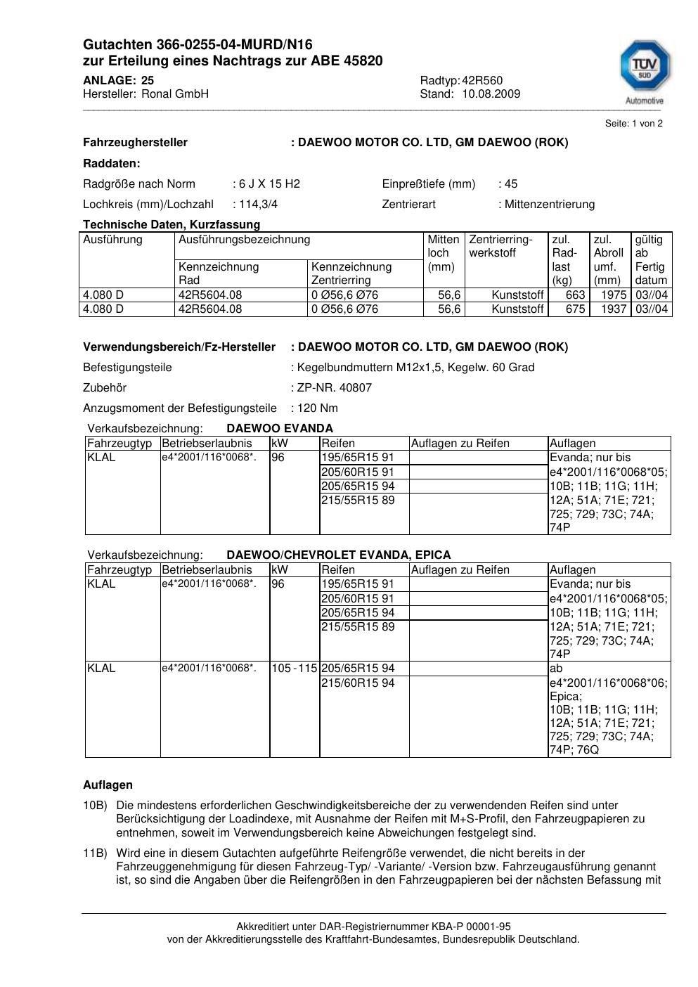Dieses Gutachten (abe) bezieht sich auf die Alufelge Ronal 42R560 in der Ausführung 6Jx15 ET 0, Mittenloch 0 mm (KBA 45820). Im PDF findest du typischerweise zulässige Reifengrößen, Auflagen/Anbauhinweise und – je nach Dokument – Hinweise zur Eintragung.