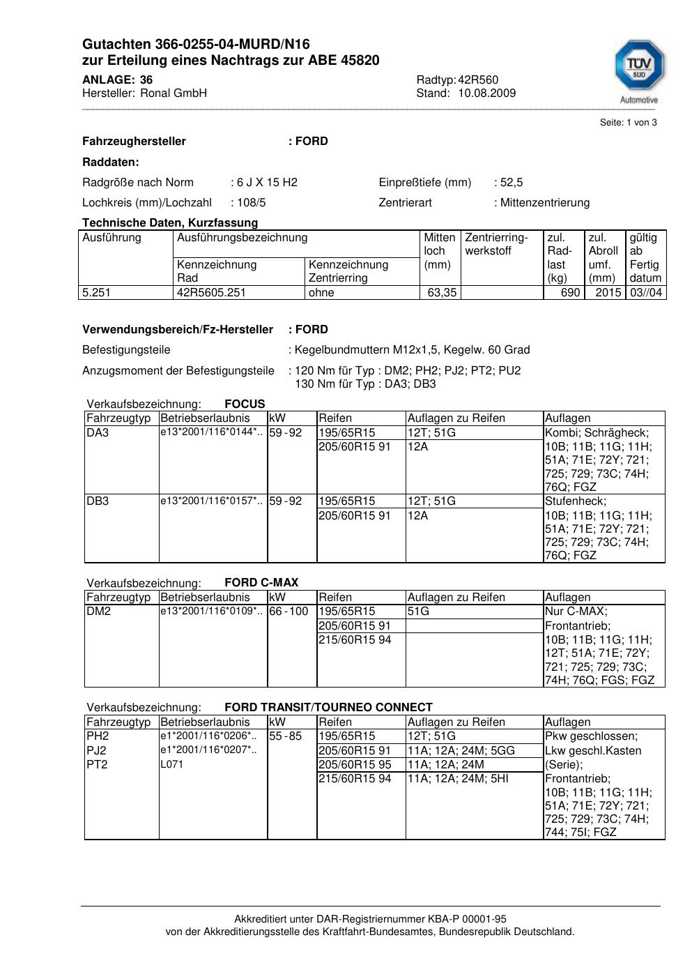 Dieses Gutachten (abe) bezieht sich auf die Alufelge brand-ronal 42R560 in der Ausführung 6Jx15 ET 0, Mittenloch 0 mm (KBA 45820). Im PDF findest du typischerweise zulässige Reifengrößen, Auflagen/Anbauhinweise und – je nach Dokument – Hinweise zur Eintragung.