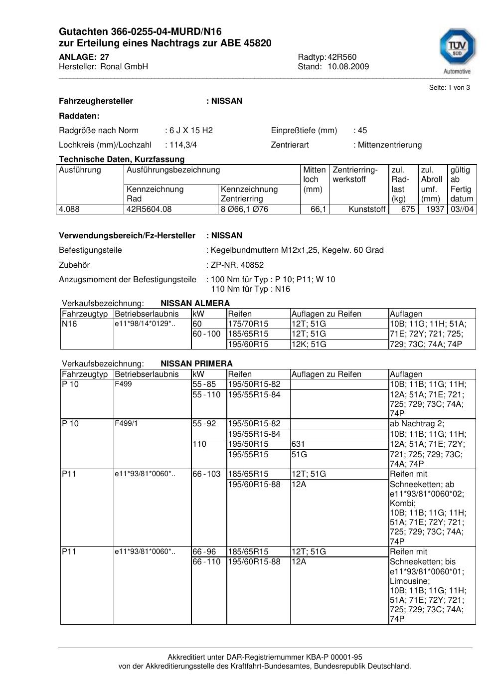 Dieses Gutachten (abe) bezieht sich auf die Alufelge Ronal 42R560 in der Ausführung 6Jx15 ET 0, Mittenloch 0 mm (KBA 45820). Im PDF findest du typischerweise zulässige Reifengrößen, Auflagen/Anbauhinweise und – je nach Dokument – Hinweise zur Eintragung.