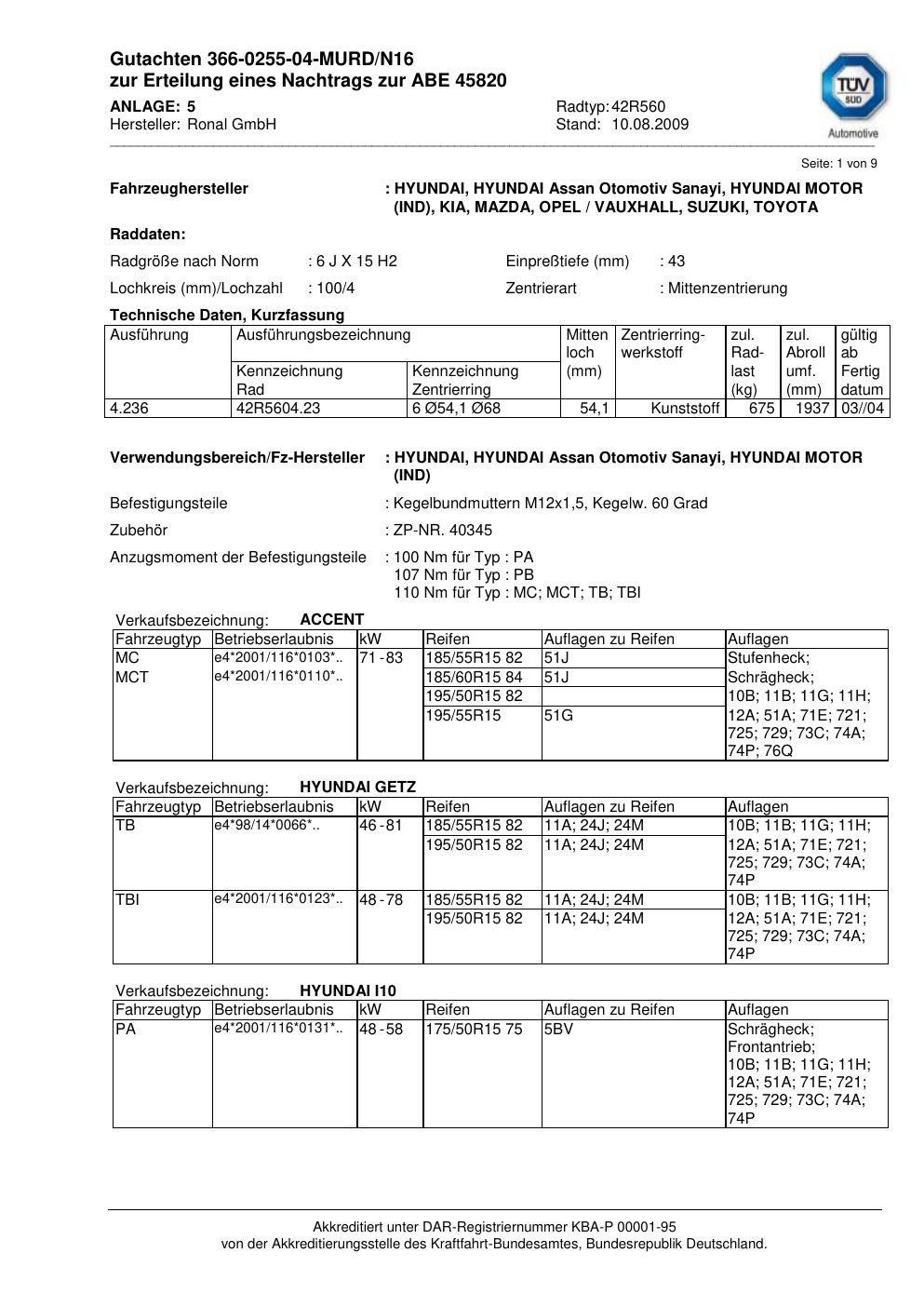 Dieses Gutachten (abe) bezieht sich auf die Alufelge Ronal 42R560 in der Ausführung 6Jx15 ET 0, Mittenloch 0 mm (KBA 45820). Im PDF findest du typischerweise zulässige Reifengrößen, Auflagen/Anbauhinweise und – je nach Dokument – Hinweise zur Eintragung.