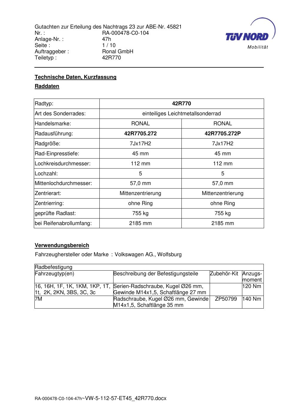 Dieses abe der Marke Ronal stammt vom jeweiligen Hersteller, Importeur oder einer Prüforganisation. Felgengutachten.de beansprucht hieran keine eigenen Urheber-, Nutzungs- oder sonstigen Schutzrechte. Soweit das Dokument urheber- oder leistungsschutzrechtlich geschützt ist, verbleiben die Rechte beim jeweiligen Rechteinhaber. Die Bereitstellung erfolgt ausschließlich zu Informationszwecken für Endnutzer, z. B. zur Vorlage bei Prüfstellen oder zur eigenen Fahrzeugdokumentation.