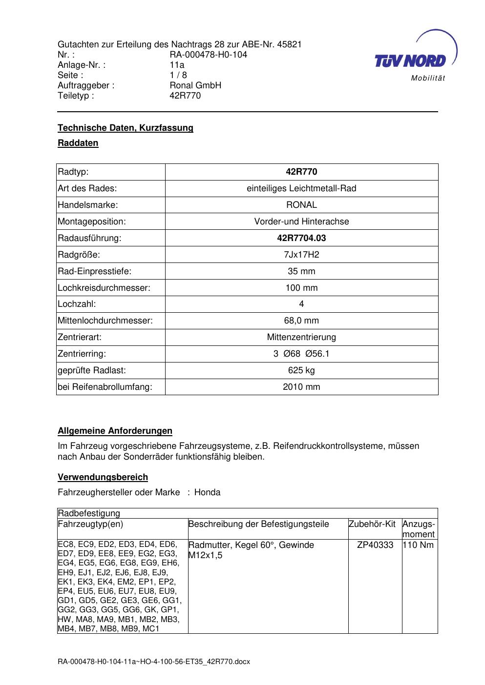 • Stimmt die KBA-Nummer auf der Felge mit diesem Dokument überein?