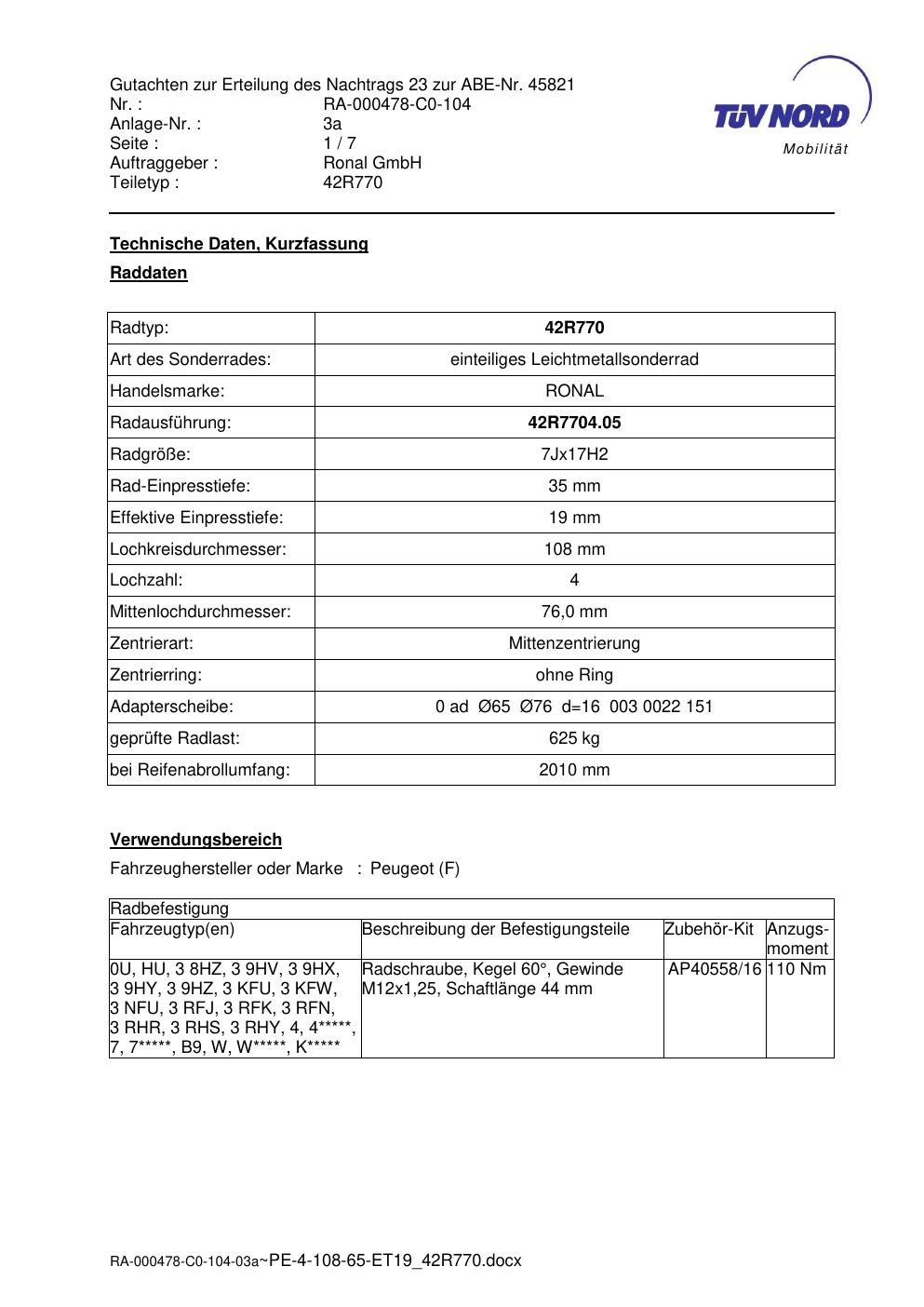 Dieses Gutachten (abe) bezieht sich auf die Alufelge Ronal 42R770 in der Ausführung 7Jx17 ET 0, Mittenloch 0 mm (KBA 45821). Im PDF findest du typischerweise zulässige Reifengrößen, Auflagen/Anbauhinweise und – je nach Dokument – Hinweise zur Eintragung.
