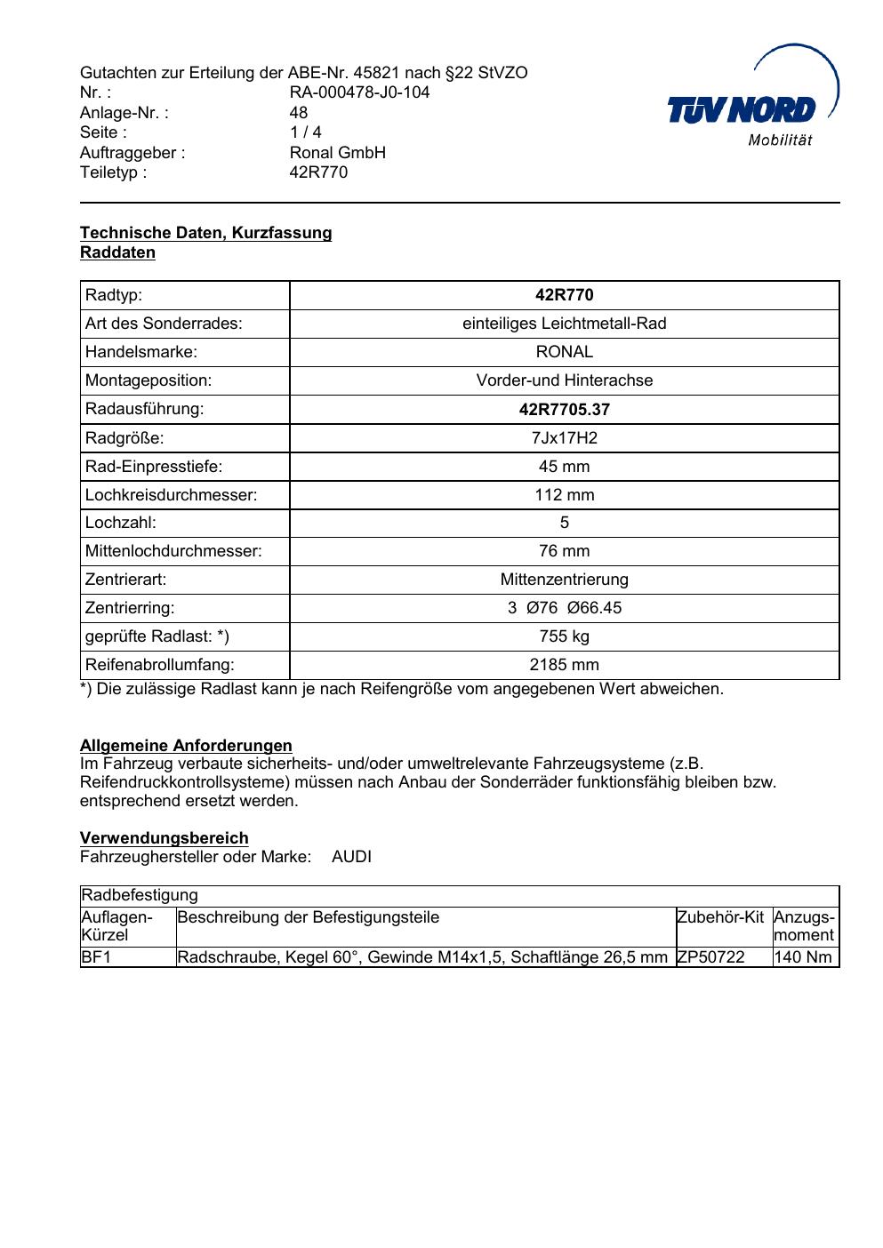 Dieses abe gehört zur Felge Ronal 42R770 in 7Jx17 ET0 mit KBA 45821. Die Seite ist dafür gedacht, dass du schnell prüfen kannst, ob KBA, Design und Größe zu deiner Felge passen und danach direkt das richtige PDF lädst.
