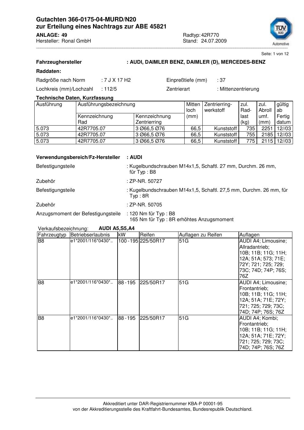 Dieses Gutachten (abe) bezieht sich auf die Alufelge Ronal 42R770 in der Ausführung 7Jx17 ET 0, Mittenloch 0 mm (KBA 45821). Im PDF findest du typischerweise zulässige Reifengrößen, Auflagen/Anbauhinweise und – je nach Dokument – Hinweise zur Eintragung.
