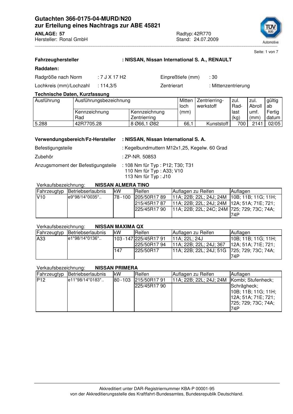 Dieses Gutachten (abe) bezieht sich auf die Alufelge Ronal 42R770 in der Ausführung 7Jx17 ET 0, Mittenloch 0 mm (KBA 45821). Im PDF findest du typischerweise zulässige Reifengrößen, Auflagen/Anbauhinweise und – je nach Dokument – Hinweise zur Eintragung.