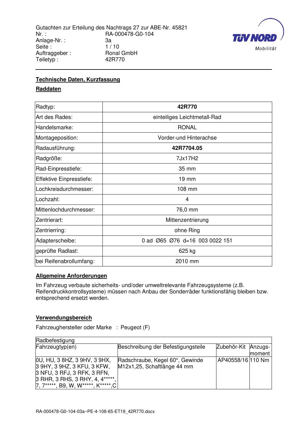 Diese Allgemeine Betriebserlaubnis (ABE) bezieht sich auf die Felge Ronal 42R770 in der Ausführung 7Jx17 ET0 mit der KBA 45821. Eine ABE ist eine bauartspezifische Genehmigung, die der Hersteller beim Kraftfahrt-Bundesamt (KBA) erwirkt hat. Sie erlaubt die Verwendung der Felge an den im Dokument genannten Fahrzeugen ohne zusätzliche Einzelabnahme, solange sämtliche im Gutachten aufgeführten Auflagen eingehalten werden.