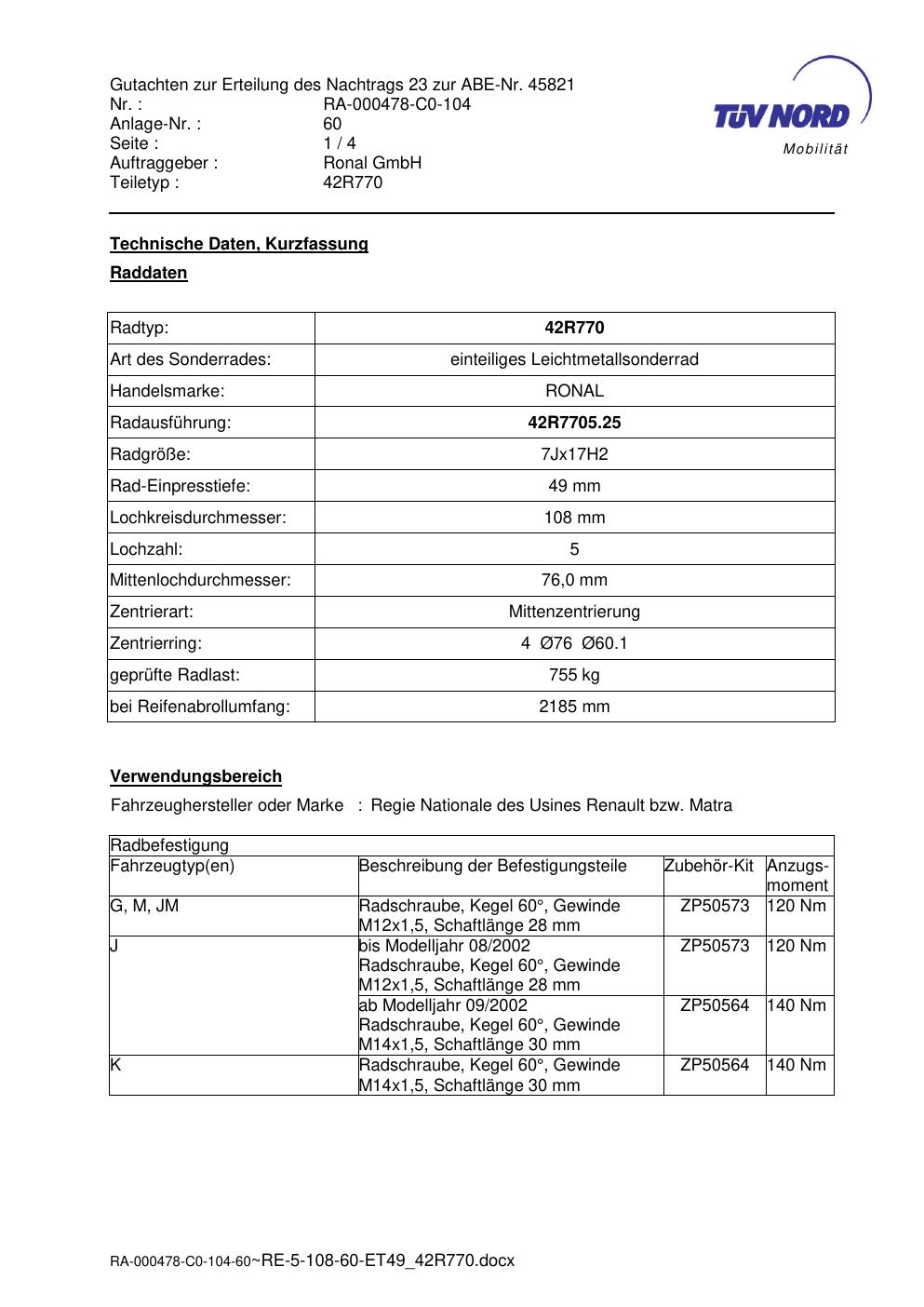 Dieses Gutachten (abe) bezieht sich auf die Alufelge Ronal 42R770 in der Ausführung 7Jx17 ET 0, Mittenloch 0 mm (KBA 45821). Im PDF findest du typischerweise zulässige Reifengrößen, Auflagen/Anbauhinweise und – je nach Dokument – Hinweise zur Eintragung.